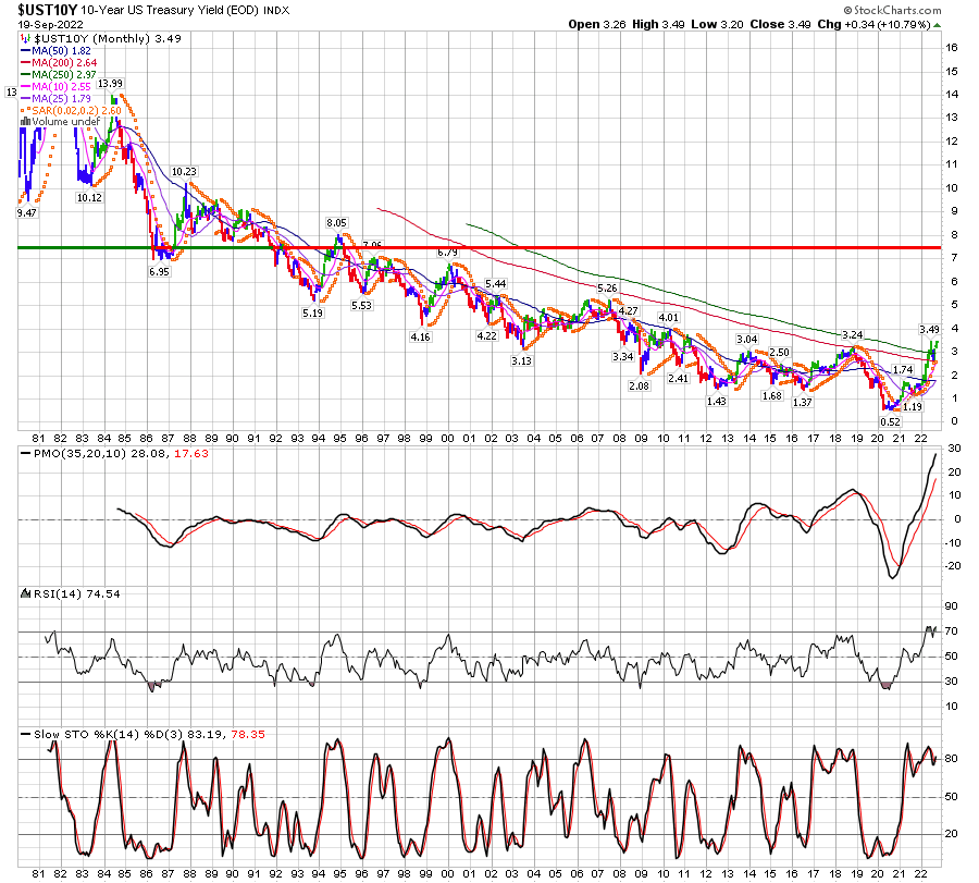 ניתוח רק טכני של גרף הריבית על פני 40 השנים האחרונות בין השנים 1982-2022. בספטמבר 82 עמדה הריבית על 15% ומנקודה זו החלה לצנוח. המגמה הדובית נמשכה עד אפריל 2020 כשנגעה ברמת התמיכה של 0.63%. רמת תמיכה זו נבחנה מספר פעמים והחלה צמיחה. במרץ 2022 הריבית עברה את רמת 2.25% והמגמה הדובית ארוכת השנים התהפכה והיא כעת שורית. לנתון זה מתקבלים אישורים ממתנדים רבים. הצמיחה בכיוון איזור ההתנגדות של ברמה של 7.5%.