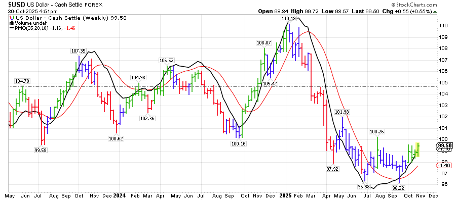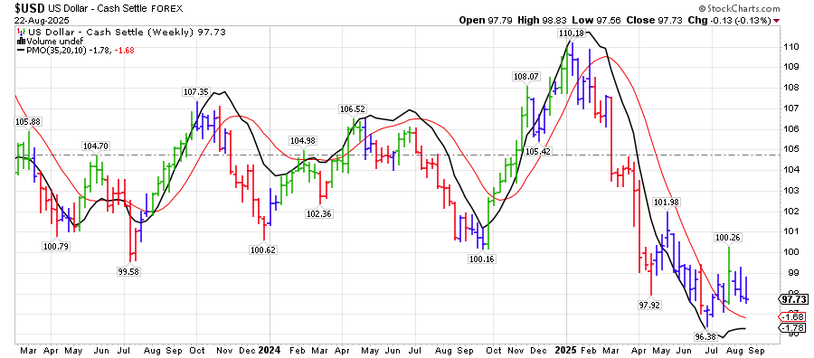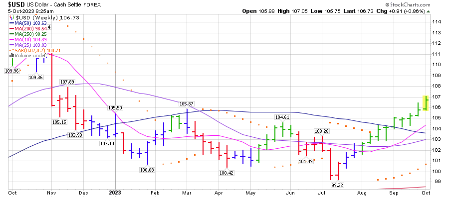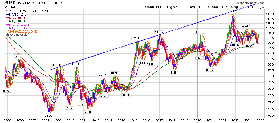 מדד הדולר בתמונה ארוכה חווה תנודה גדולה. במרץ 2007 המדד יצא מנק' שפל ברמת 72 נק' כשמגמת הגרף היית עוד דובית. באמצע 2013 המגמה התהפכה ועברה לשורית. בשנת 2021 הוא בחן לפחות פעמיים את רמות התמיכה סביב 89 נק'. מיוני 21 צמח בהתמדה לרמת שיא של 114 נק' ב-26 בספטמבר 2022. בפברואר 2023 ובאפריל הוא בחן את רמת התמיכה של 100 נק' עוד נגע ברמת 99 נק' ומאז המדד בנסיקה. קשה להעריך היכן תהיה רמת השיא והיכן תתהפך תנועת הגרף. אם נציב את הקווים ורמות התמיכה וההתנגדות נוכל להעריך היפוך טכני באזור ה-125 נק'. כוחות השוק הם הקובעים את הגרף ולא הקווים.