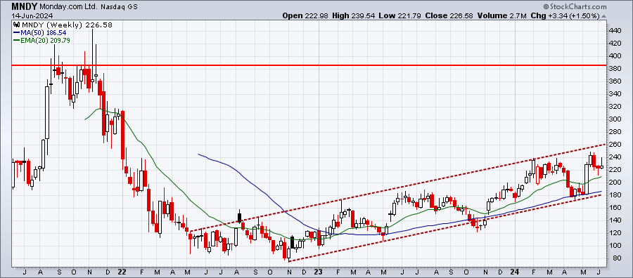 ברמה השבועית המגמה הראשית שורית. אחרי שהמניה בחנה רמות התנגדות ב-240 דולר וב-236 דולר אך עדיין על קצה תנועת הלונג. לגרף יש תכונה של מעבר לשורט בכיוון מחיר מטרה של 160 דולר. ברמת ניתוח ארוכה לחודשים רבים קדימה, הגרף שואף לרמת מחיר באזור ה-420 דולר.