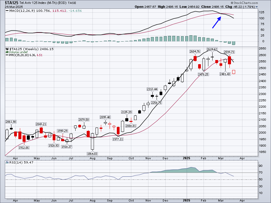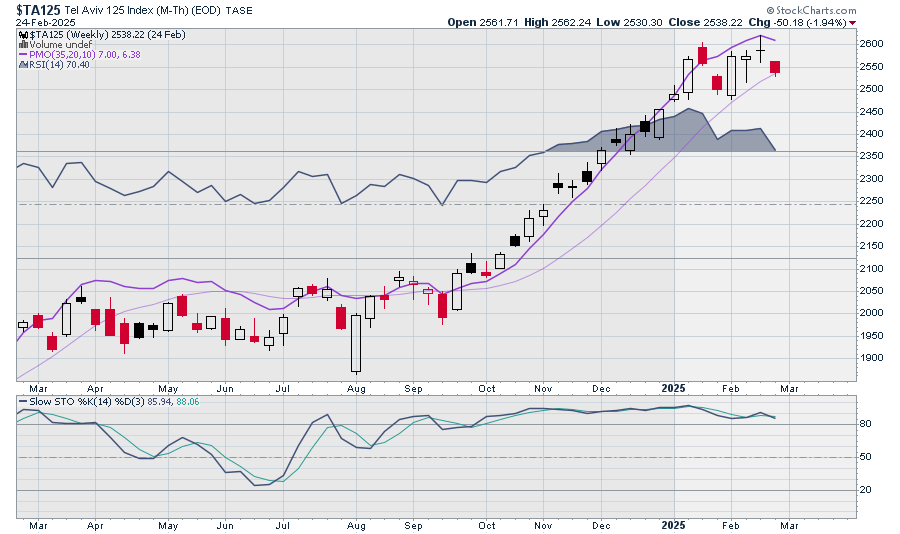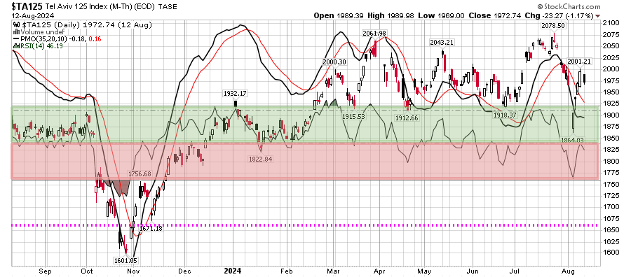 המדד בגרף היומי דובי. הירידה מהשיא ב-2070 נק' עברה בדרך מטה תוך חציית קו המגמה העולה באזור 1910 נק' והמגמה הפכה דובית. בעקבות התנודתיות הגרף נשא לונג וכעת הוא בשורט וזאת נראה עם מתנד ה-RSI בגזרה האדומה של השורט. כעת ניצבת תמיכה חזקה באזור ה-1660 נק' גם בכל רמת ניתוח.