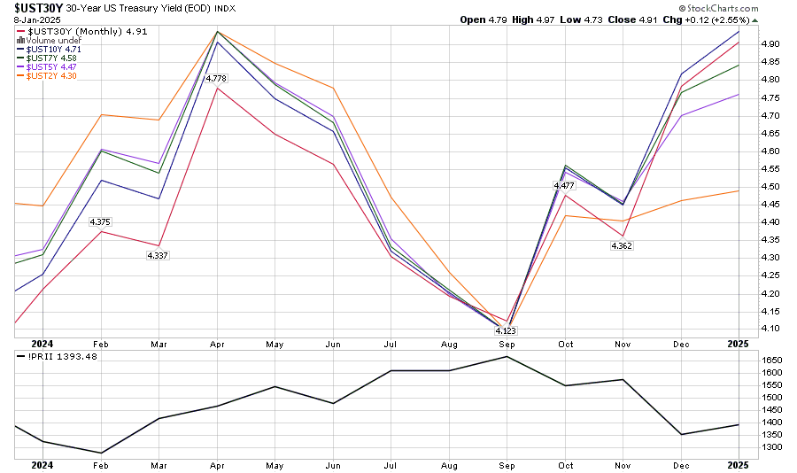 להלן תמונת תנועת הריביות של האג"ח של 30 שנים (אדום), 10 שנים (כחול), 7 שנים (ירוק), 5 שנים (סגול) ושנתיים (צהוב) בגרף שנתי.