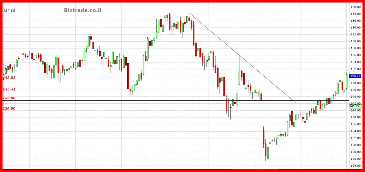 המחיר התממש מקו ה 156$ , יורד ל 142$ שהוא הקו החשוב באזור וכבר חוזר לסגירה ב 146$.