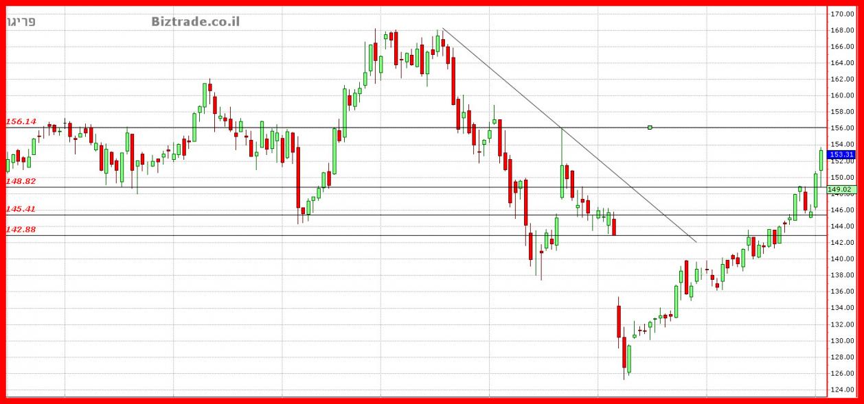 המחיר הגיע לגבוה שלשום ב 156$ ששם נמצא קו התנגדות טכני נוסף, וממנו מתממש ויורד במשך יומיים.