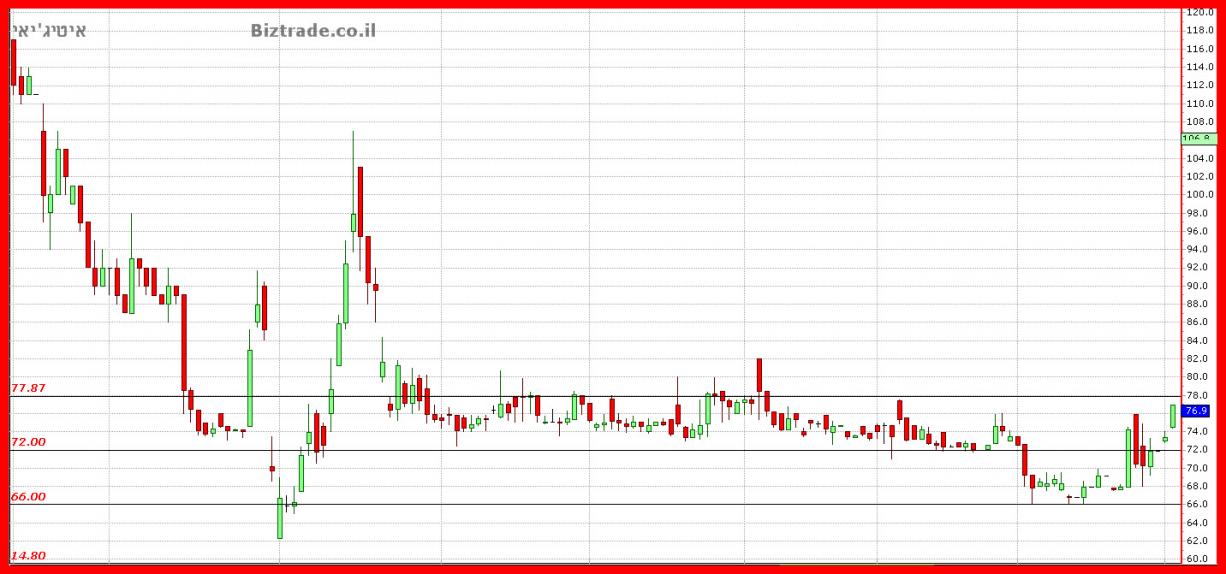 היי,עובדיה. נמכרה איטיגיי ב76.9 האם אתה צופה להמשך עליות? בגרף נראית טוב הן ביומי והן בשבועי. או צפוי מימוש ותיקון למטה.תודה