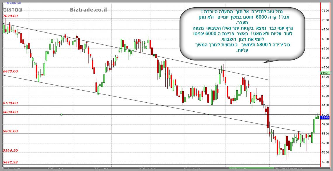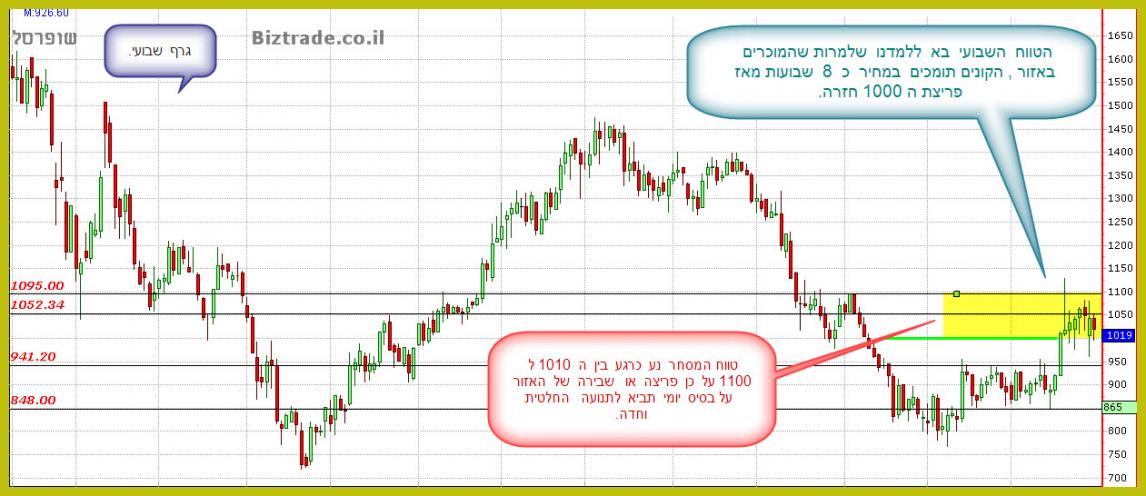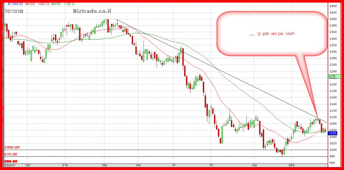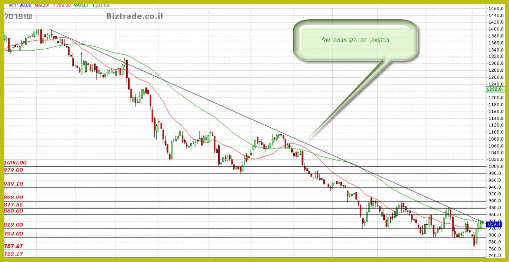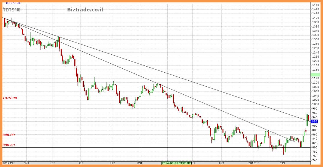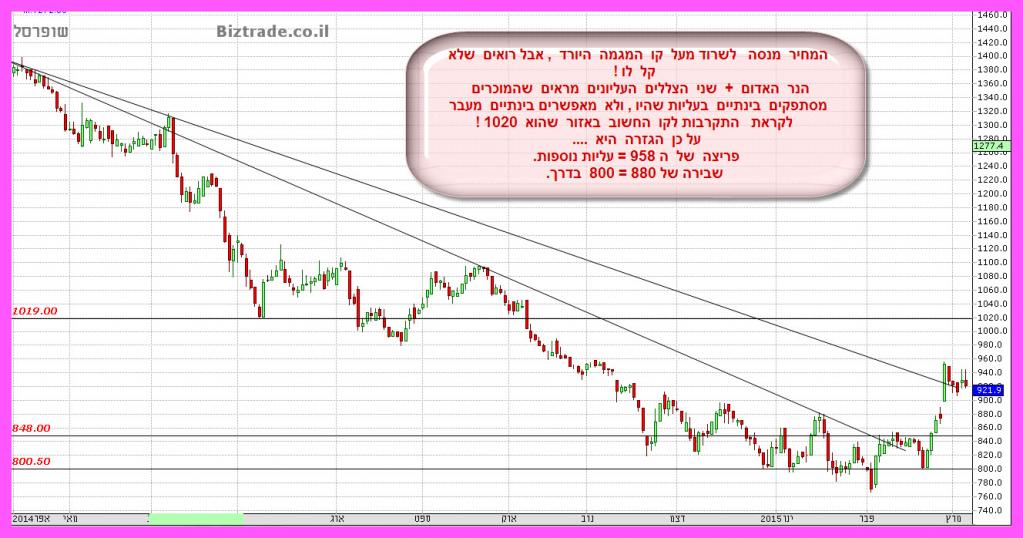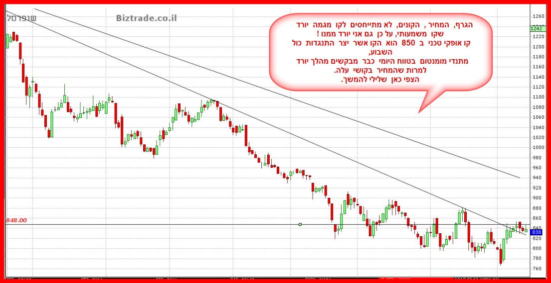 למרות העליות היפות מאד מאז פריצה חוזרת של ממוצע 20 ב-820, הגרף עדיין לא הגיע לקוים החשובים. שינוי המגמה למגמת עליה יוכל לקרות רק בפריצת ה-1020, למרות שהיתה פריצה של קוי מגמה יורדים . הנר היומי של יום ה' עדיין לא מכניס הגרף לשלילי למרות הגאפ מטה והמחזור הגדול מהסיבה שהמחיר מסיים מעל קו מגמה יורד.