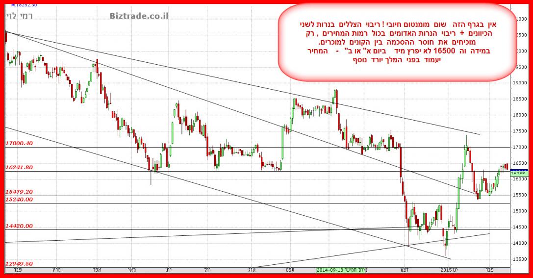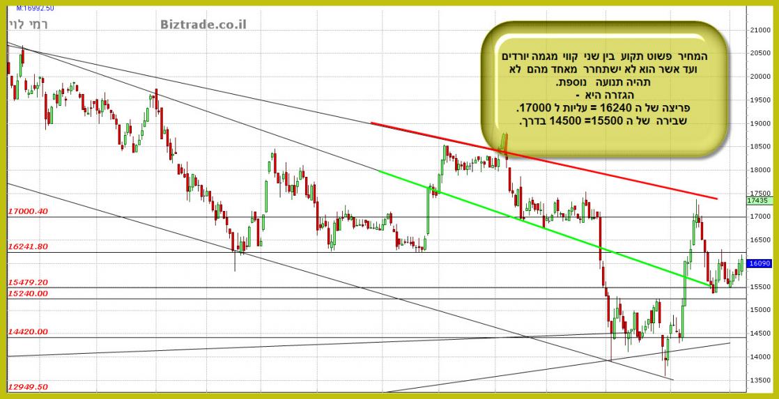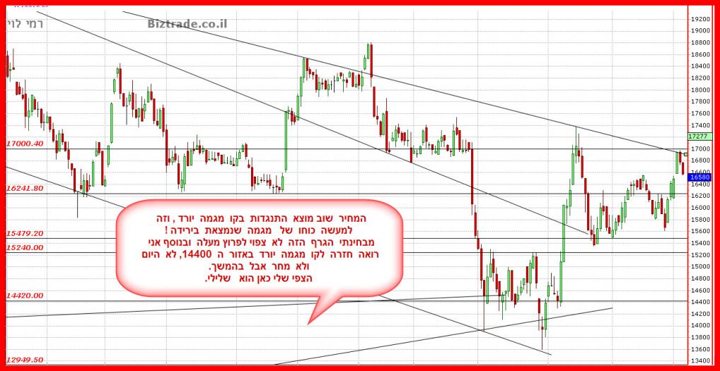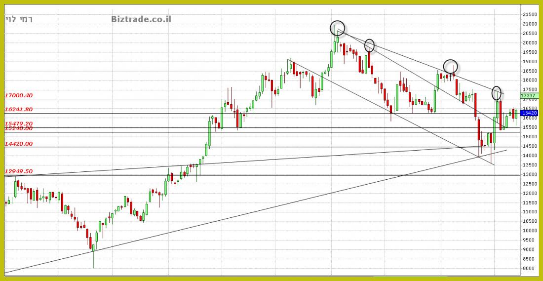 הטווח השולט במניה הוא הגרף השבועי וכל מי שעובד בחודשים האחרונים על הטווח היומי מקבל הרבה רעשים של תנודות. בגרף השבועי רואים בבירור ירידת מדרגות של המוכרים שמסומנים בגרף, כאשר המדרגה האחרונה נמצאת ב-17000. מצב הגרף מאד ברור, עליות יהיו כאן רק בפריצת ה-17000.