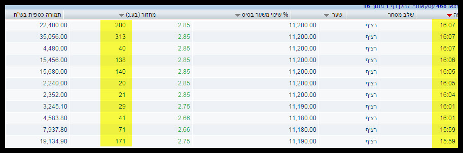 7- הלכתי לבדוק את העסקאות האחרונות לפני הסגירה , ואיני רואה משהו לא תקין = שהמוכרים מכרו בכמויות בכדי להוריד את המחיר, אלא מכירות רגילות לחלוטין ולא גדולות, ובנוסף הלכתי גם לבדוק את העסקאות מהשיא לקראת הסגירה וגם שם המוכרים לא לחצו , אלא הייתי אומר, הקונים היססו לקנות במחירים עולים.
