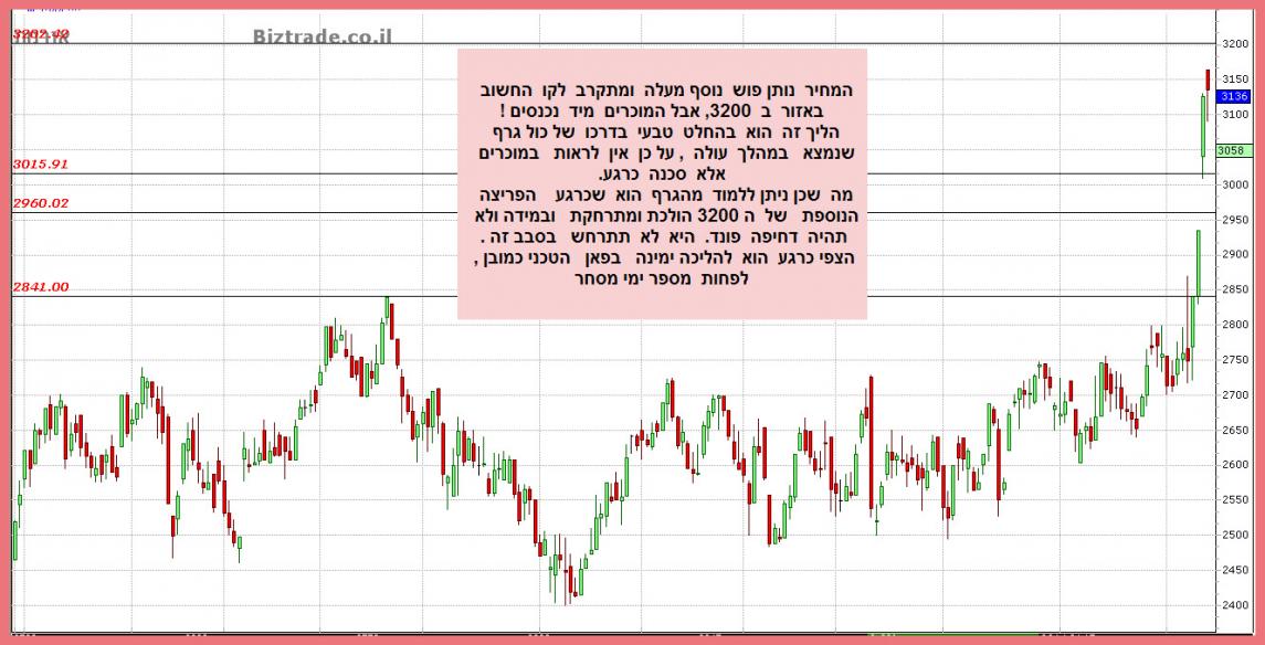 המחיר עולה היום במעל 6% ועושה את דרכו כפי שכבר עודכן ל 3200, רק שם ניתן יהיה לבחון את הגרף עם המתנדים האם פני המחיר לפריצה נוספת כהמשכיות או חזרה מטה לבדיקה של אחד הקווים החשובים.