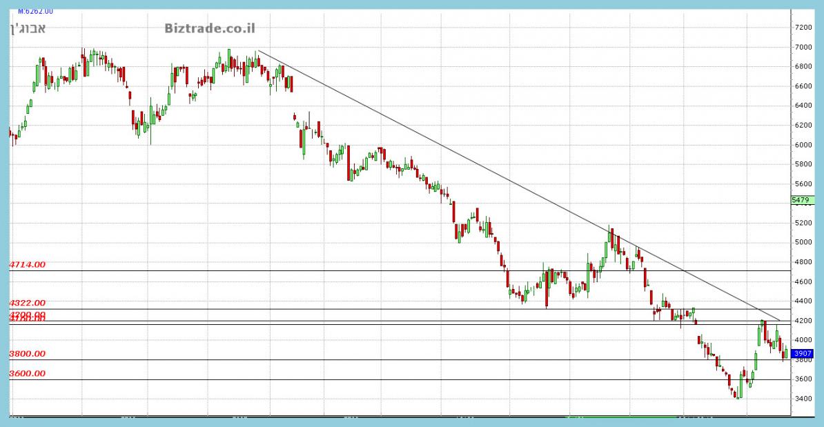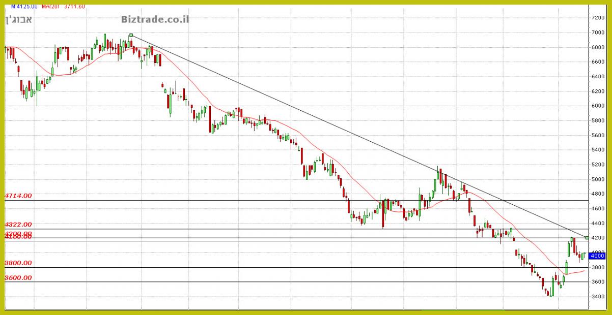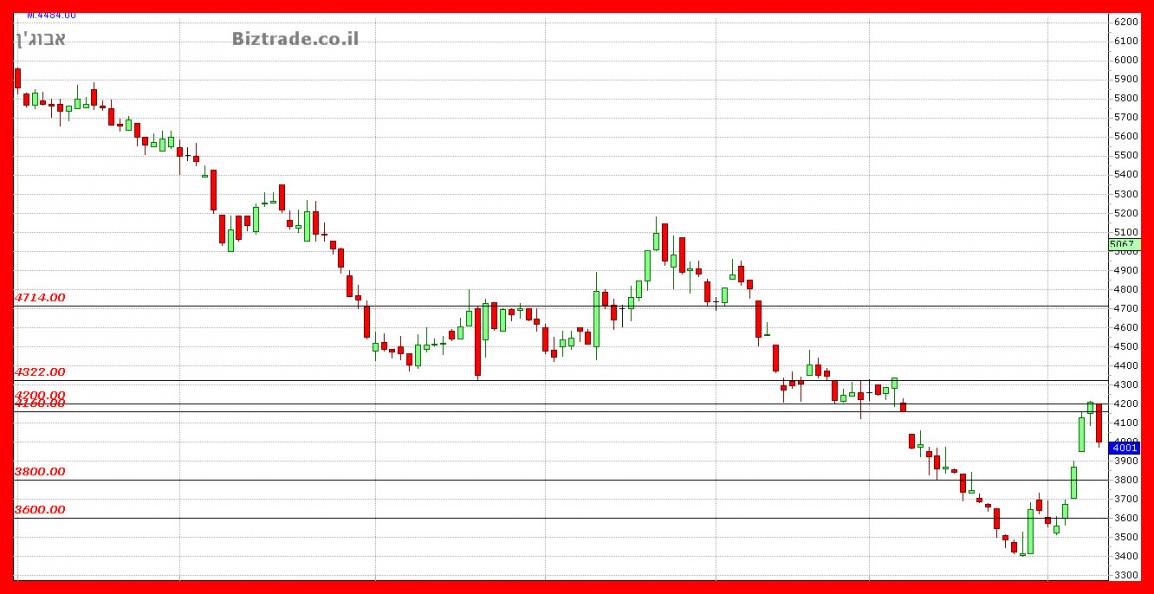 המחיר שלא מצליח לפרוץ את ה קו ב 4200 יורד כבר כ 5% מטה אל ה 4000 , והיום נסחר מתחתיו,