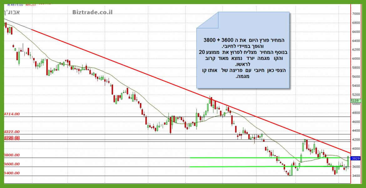 שמירה על ה 3600 עם פריצה של ה 3800 יחד עם ממוצע 20 = שוב מהלך עולה בפתח,