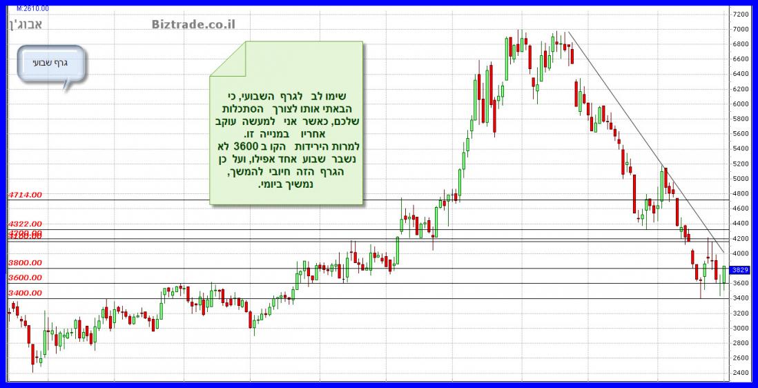 המחיר עמד והחזיק את קו ה 3800 במשך 5 ימי מסחר והיום הוא בינתיים בתוך יומי שובר אותו , ועל פי העדכונים של סופ"ש, כאשר נתתי את הגזרה לשבוע, זה אומר ששבירה החלטית היום כאן , = ירידה עם יעד טכני ל 3600.