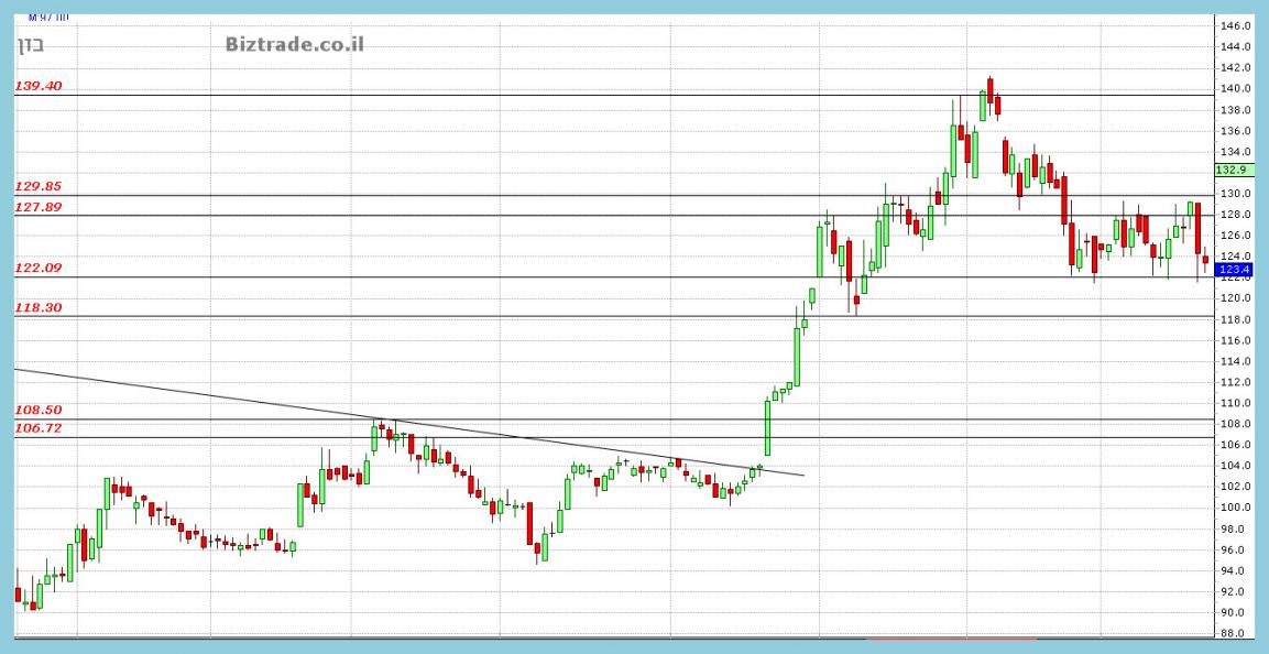 המחיר תקוע כ שלושה שבועות בטווחים שבין ה 122 -- 128,