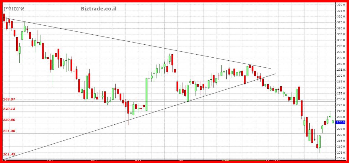 בעדכון הקודם כתבתי שאני לא אוהב את הנר היומי שנוצר , כאשר הוא נוגע בקו התנגדות ב 240, והתוצאה היתה אתמול פתיחה בגפ מטה. אבל המחיר בסופו של יום מסחר שומר על קו ה 230, כך שמשהו חריג , רע לא קרה עדיין.