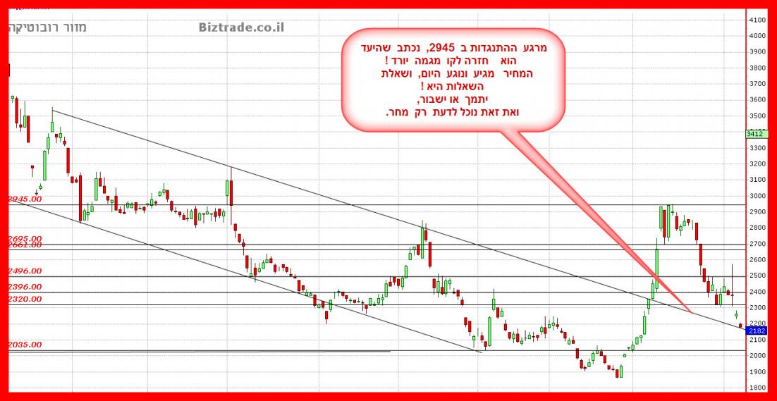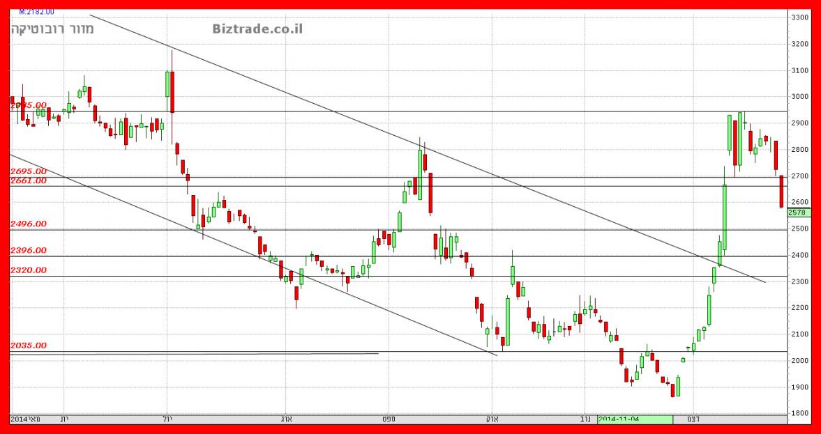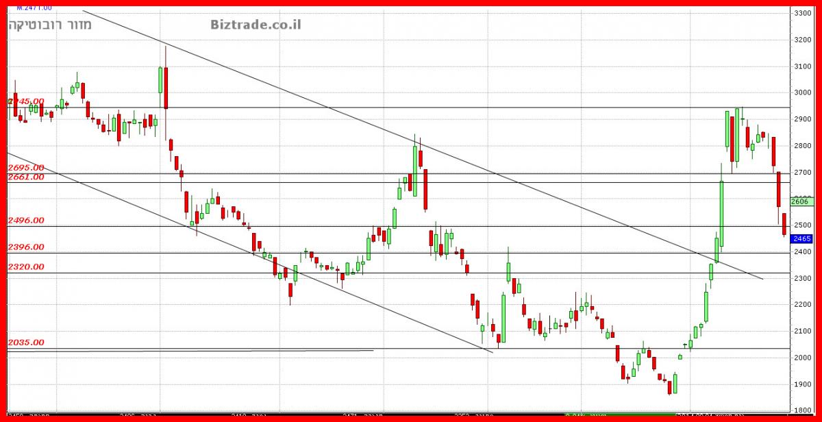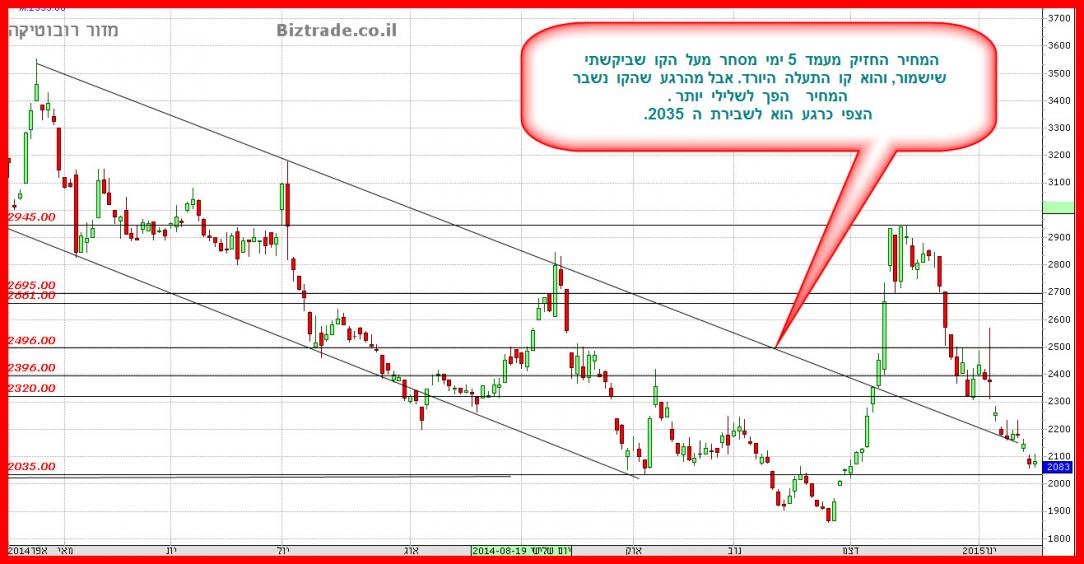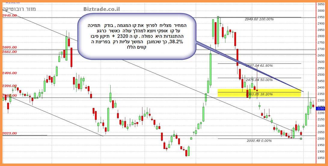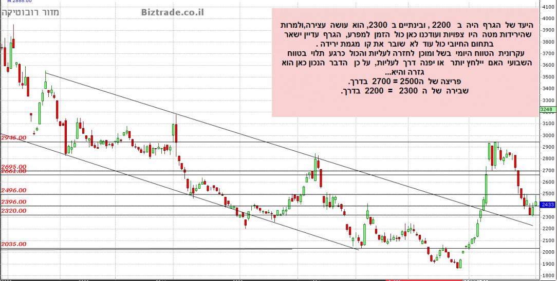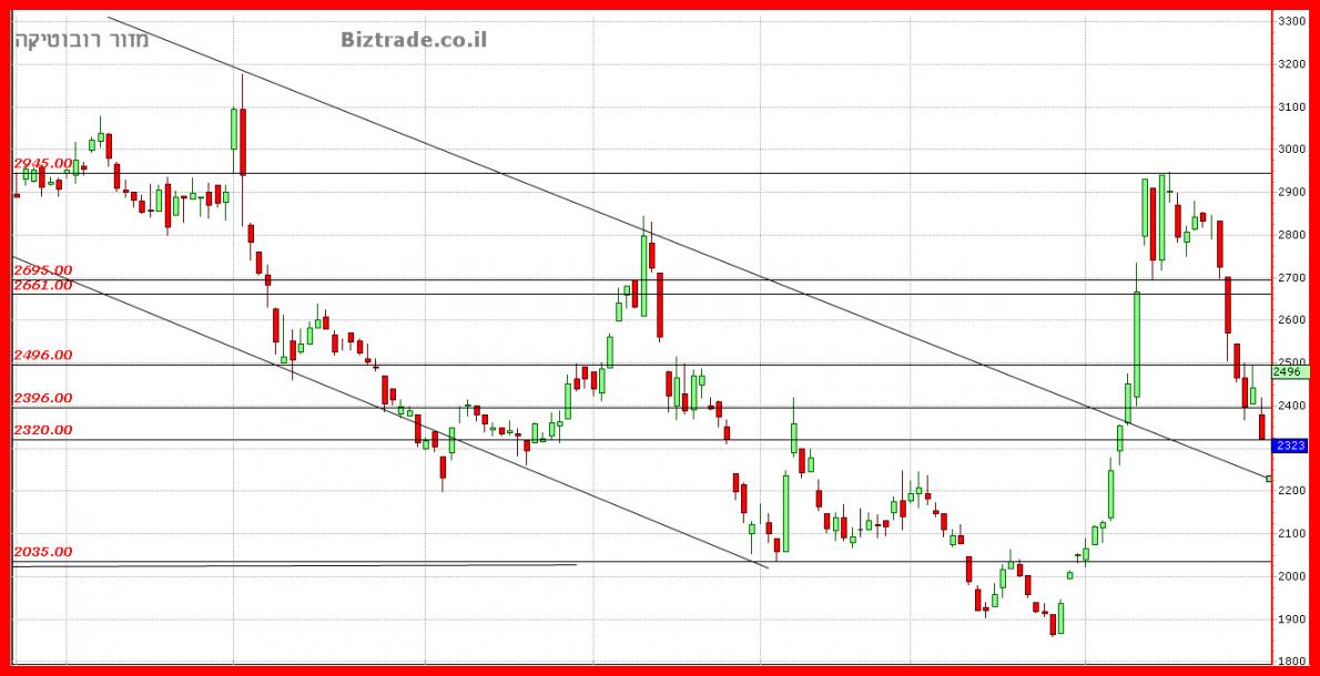 המחיר יורד היום מעל 5% וכרגע הוא פותח במהלך יורד חזק ו קולע, כאשר ה יעדים מטה הם 2280.