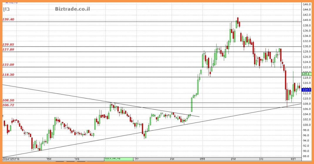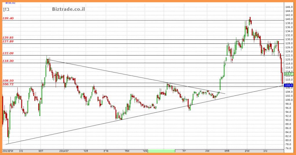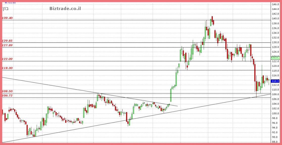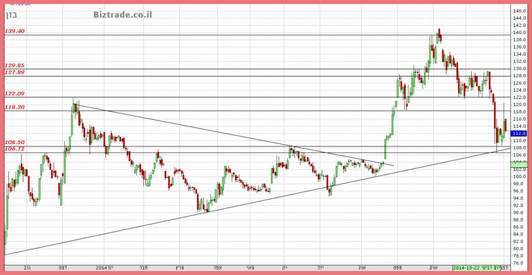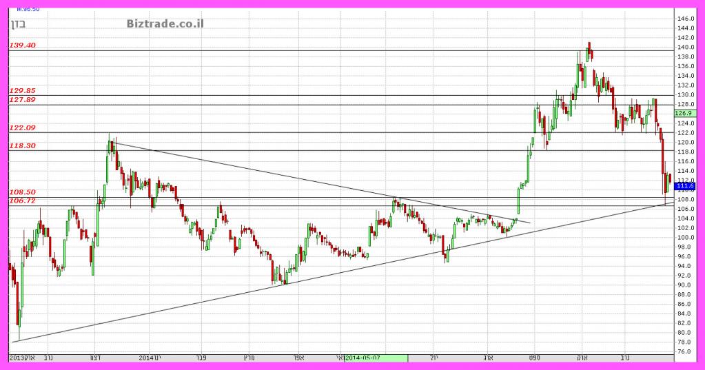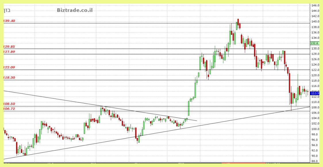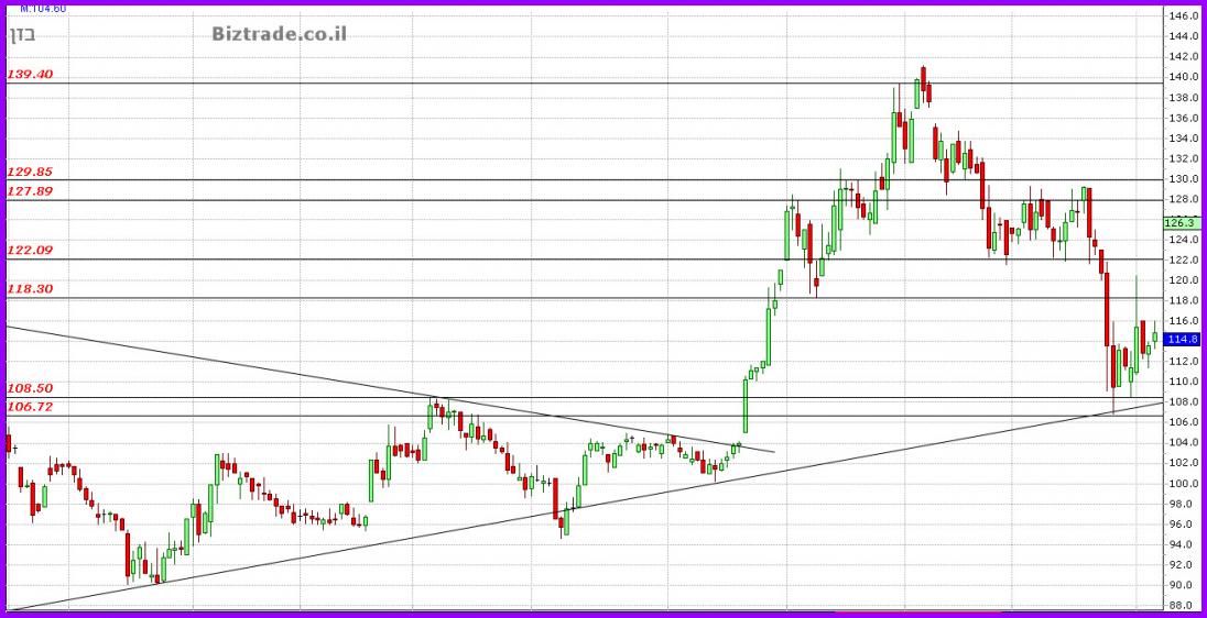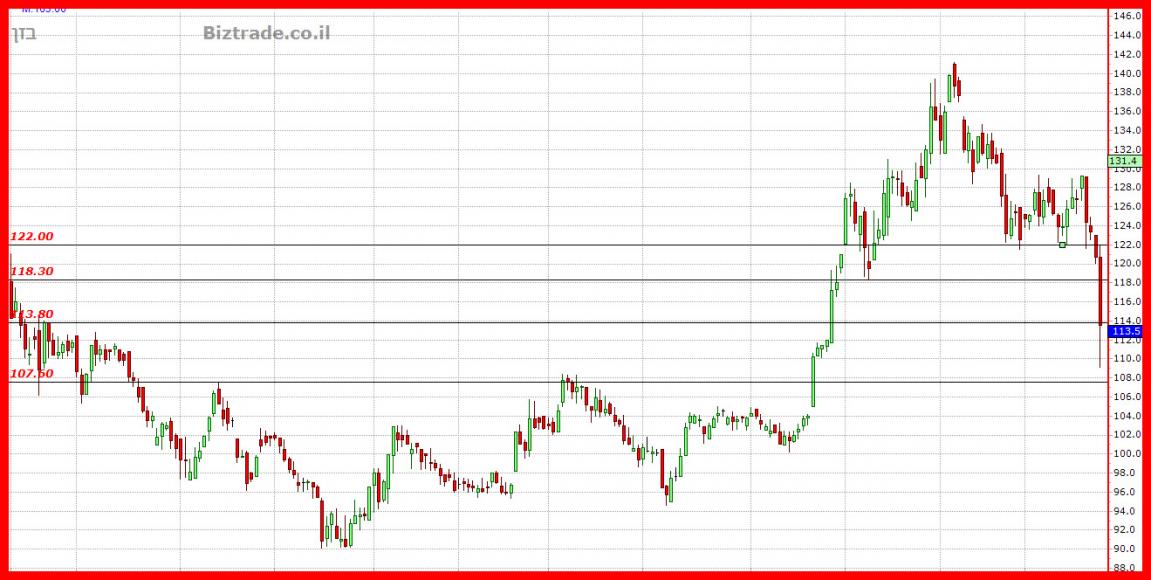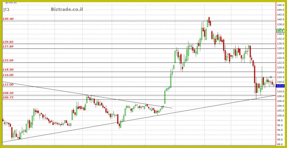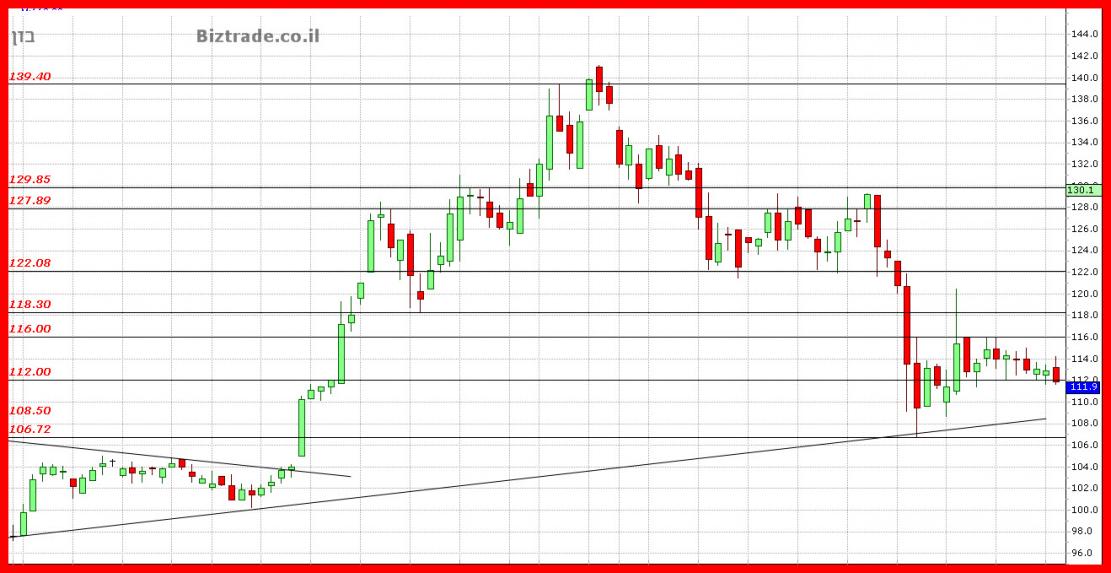 המחיר שובר את ה 113 והיום מנסה לשבור גם את ה 112, כך שבמידה וזה יקרה עד הסגירה , היעד הטכני יהיה 108.5.