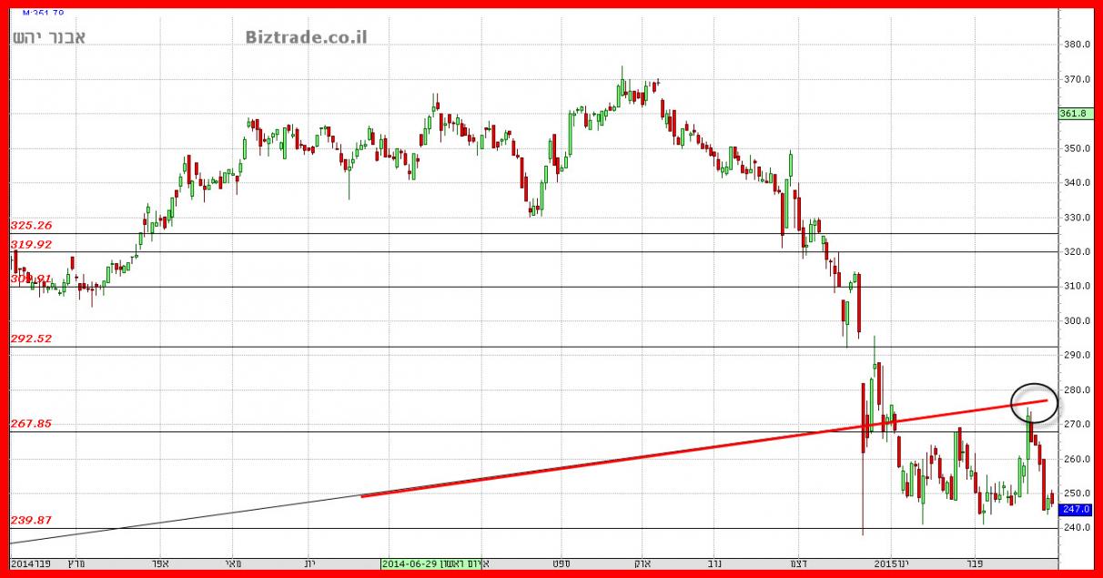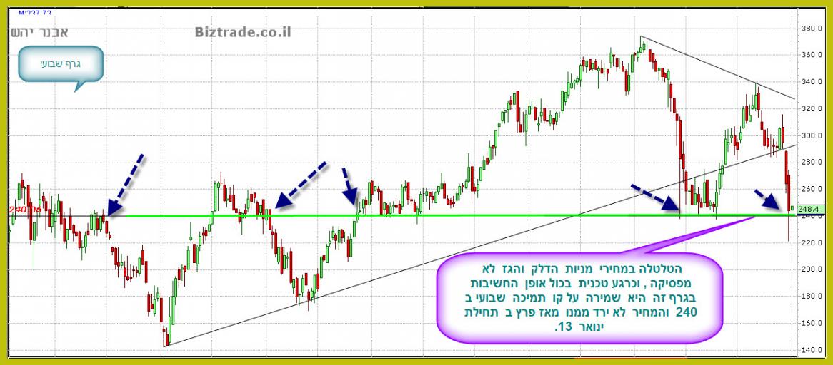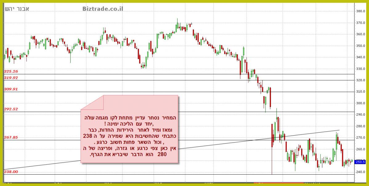 בדומה לגרף רציו המחיר עולה עד לאזור 275, בו נמצא קו מגמה עולה שבועי אשר משמש כהתנגדות. בהתקרב המחיר לנקודה המוכרים מיד נכנסים וברצף ימים אדומים מורידים את המחיר לקרבת ה-240. הגרף מסיים את השבוע ב-247, לאחר שבדק פעמיים את ה-250 ומשאיר צפי להמשך ירידה ליום המסחר הבא. הגרף עדיין שלילי.