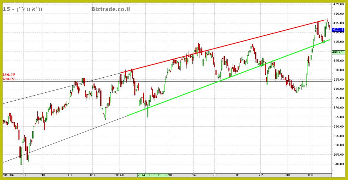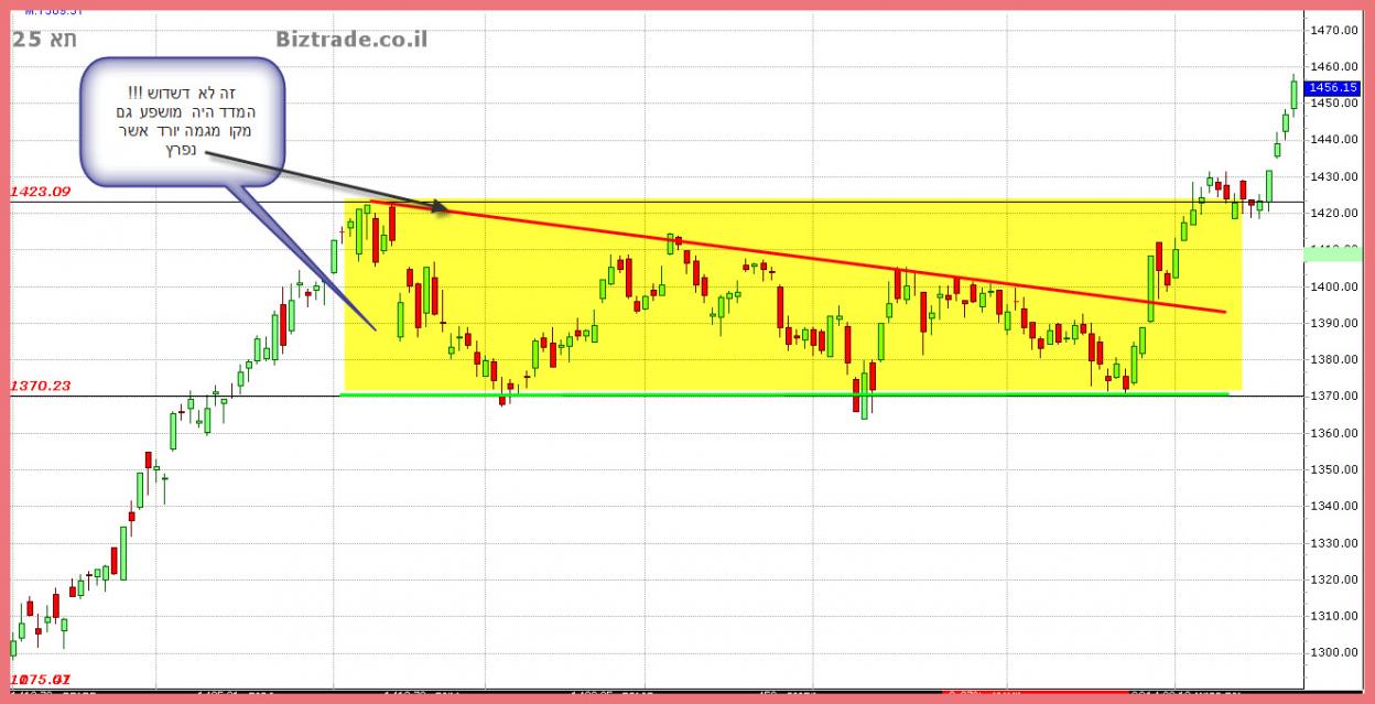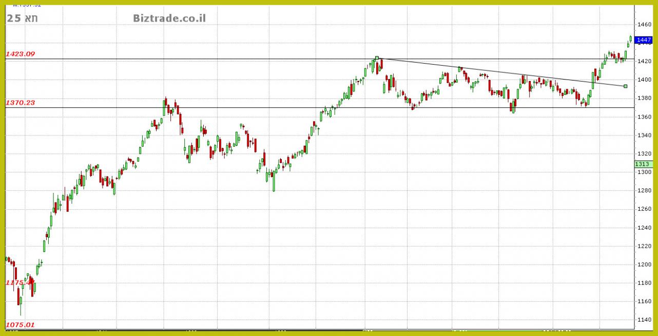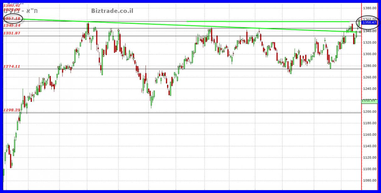 המדד פורץ קו מגמה יורד מה שיא כול הזמנים אשר היה ב1338. +