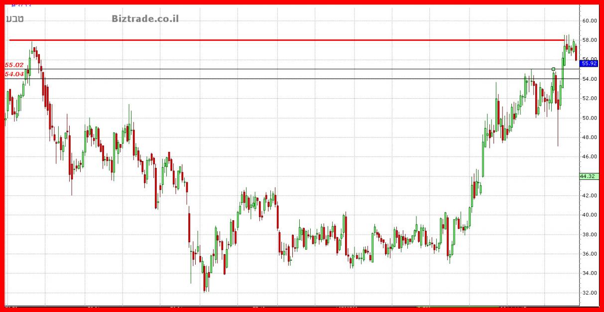הגרף המצורף הוא בטווח השבועי, על כן ניתן לראות בבירור את ההתנגדות במשך 6 שבועות בקו 58 והמחיר לא הצליח לסגור ולו שבוע אחד מעל !