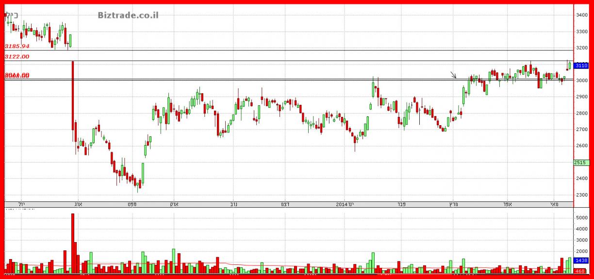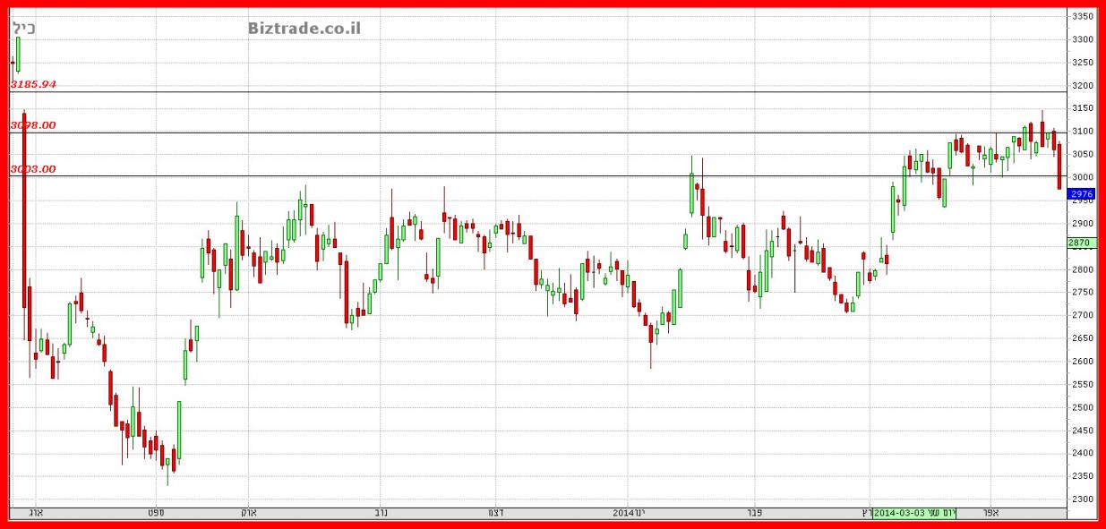 אני כותב על גרף זה לא מהסיבה שיש חדש, כי אין, המחיר עדיין תקוע בין ה 3000 -- 3100 , אבלכיל נסחרת בחצי היום הראשון ב 53 מיליון ש"ח !!!!!