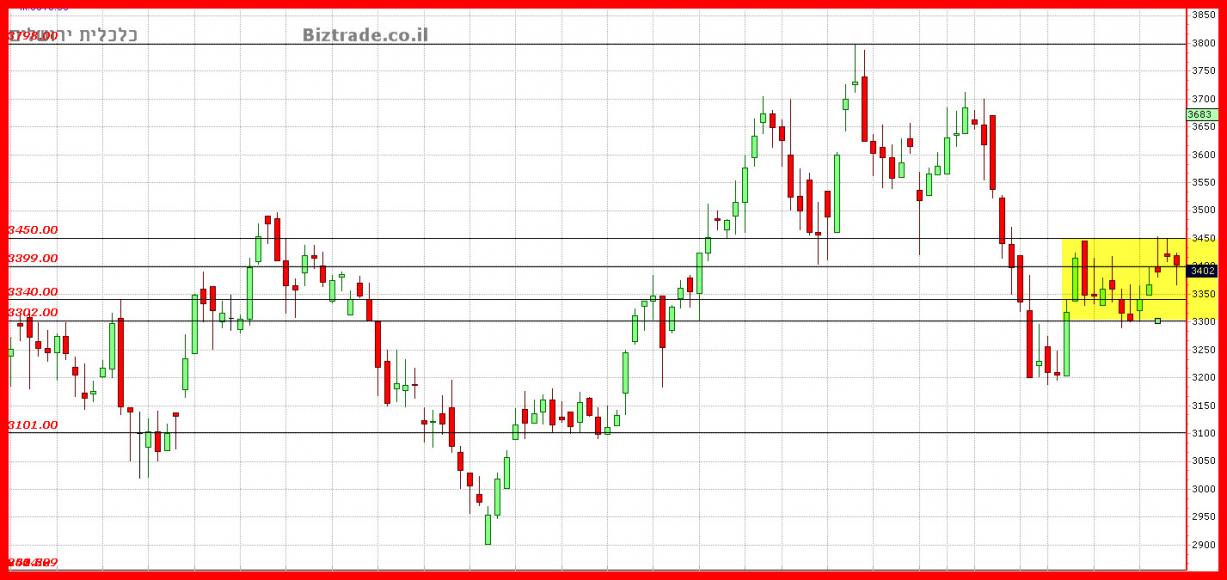להיסחר בתוך הטווח שניתן כאשר סכנת שבירת הטווח התחתון = 3300 , קיימת.