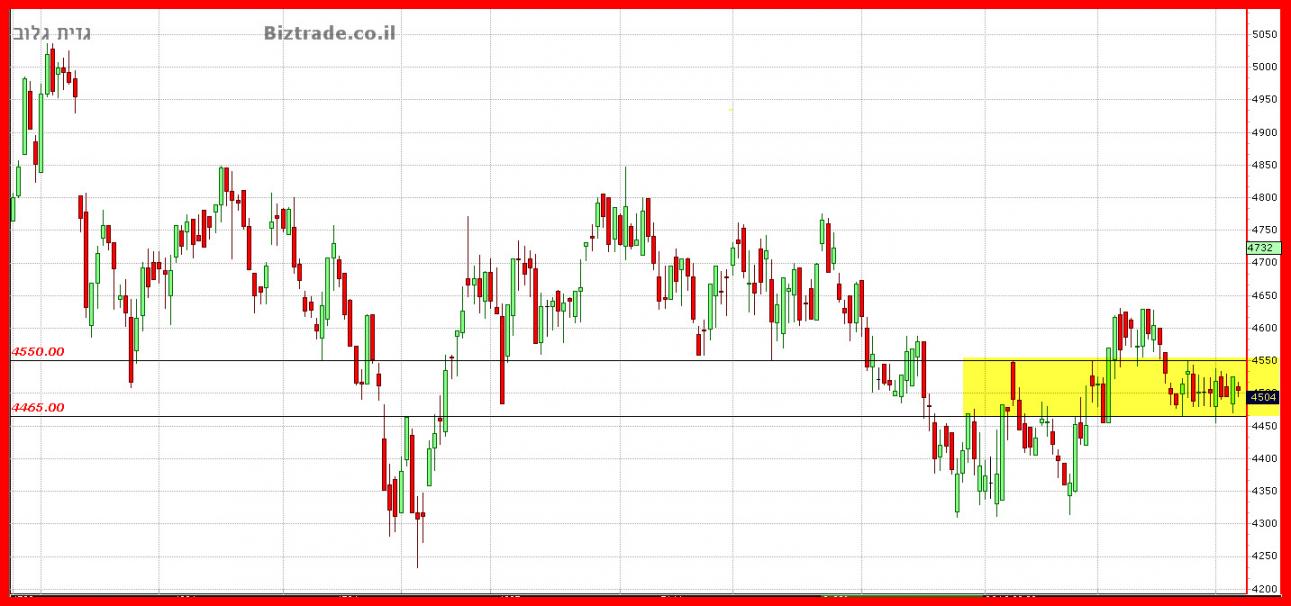 המחיר תקוע 15 יום סביב קו ה 4500 , כאשר הטווח הוא, 4465 -- 4550 ,