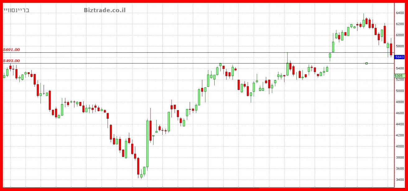 לחץ המוכרים ממשיך בגרף זה , כאשר היום נשבר קו אופקי ב 5690 , והמחיר מתקרב מאוד לקו האופקי החשוב באזור ב 5493,