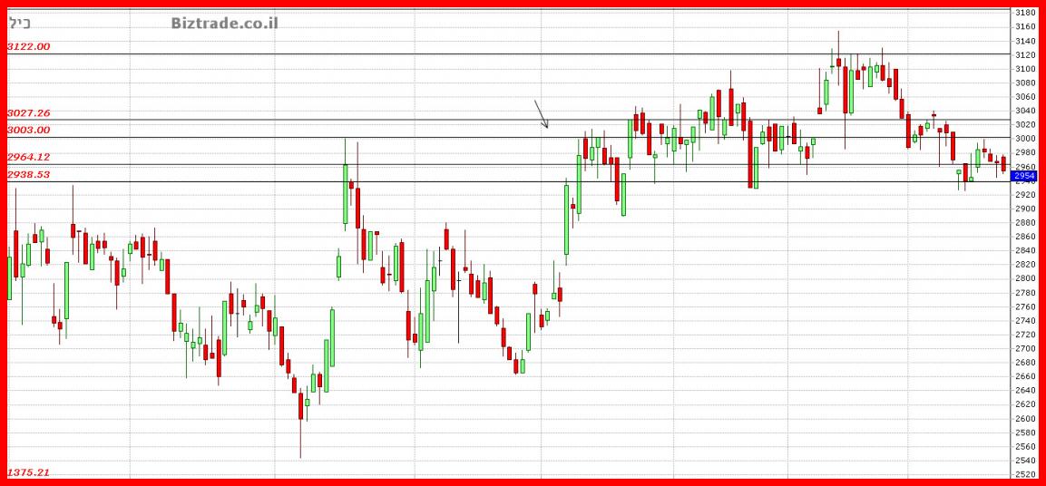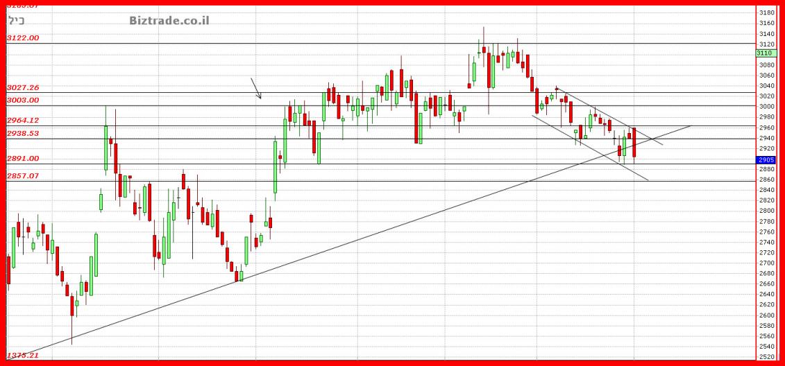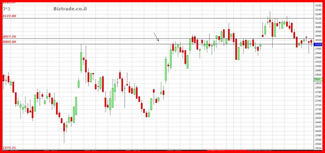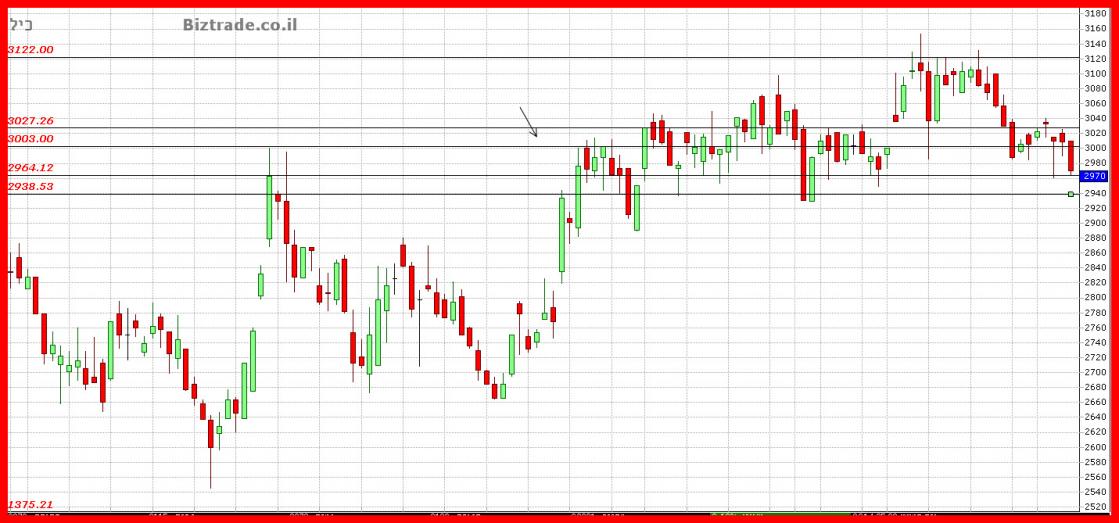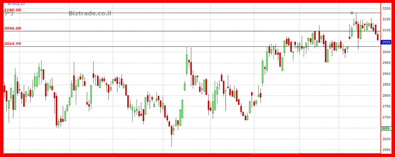 היום בפקיעה המחיר יורד מ 3100, שהיתה מדרגה שהחזיקה. וסוגר ב 3055 , שהוא 5 נק" מעל המדרגה הנוספת.