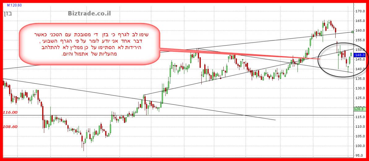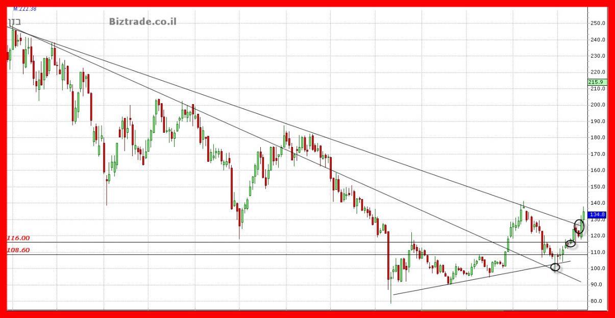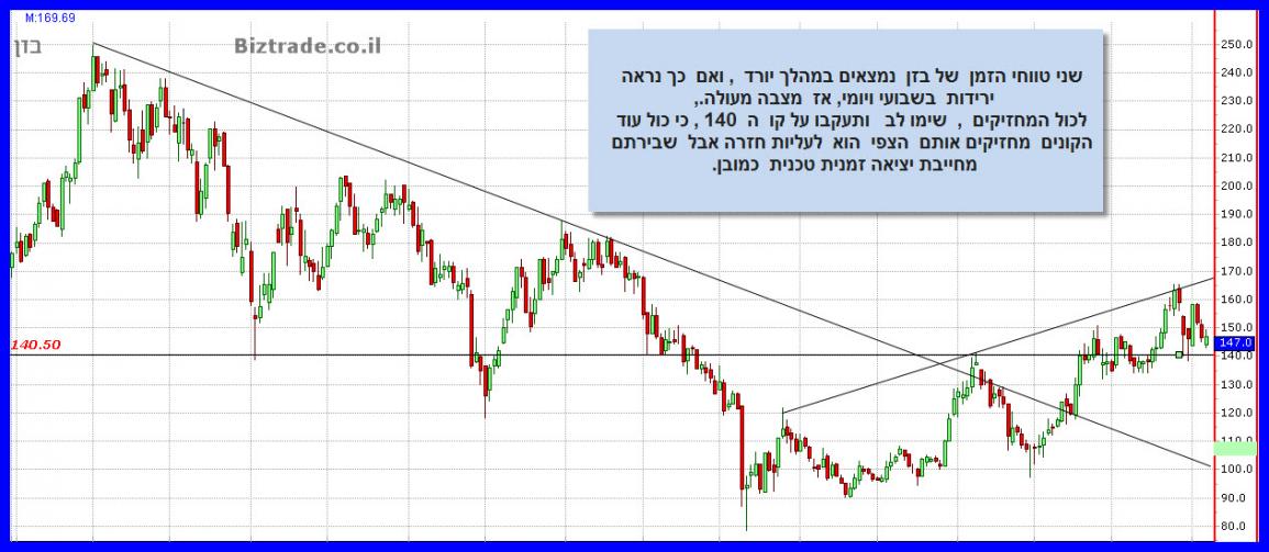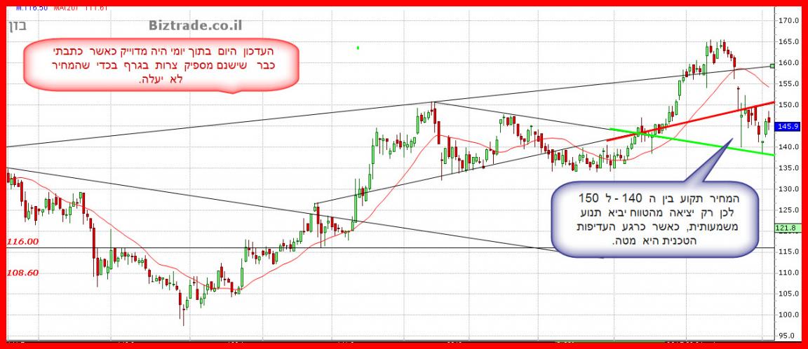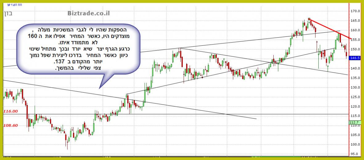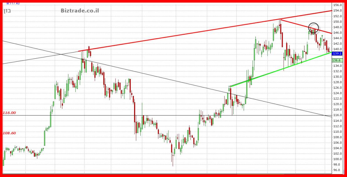 המחיר נעול בינתיים בתוך טווח נתון על ידי קו מגמה עולה ויורד , ומבחינת כניסה טכנית היא קיימת רק בפריצת ה 146, מה שלא נראה שיקרה בתקופה הקרובה כי הקו העליון הוא גם שיא יורד, ובכך ייצור מספיק התנגדות שזה לא יקרה , ומצד שני שבירת הקו התחתון שולח את המחיר ל 136 -- 130 .