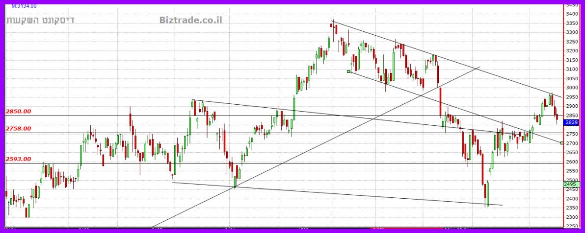 היעד כרגע הוא מטה לעבר הקו התחתון של התעלה , כאשר אתמול גם קו אופקי ב2850 נשבר.