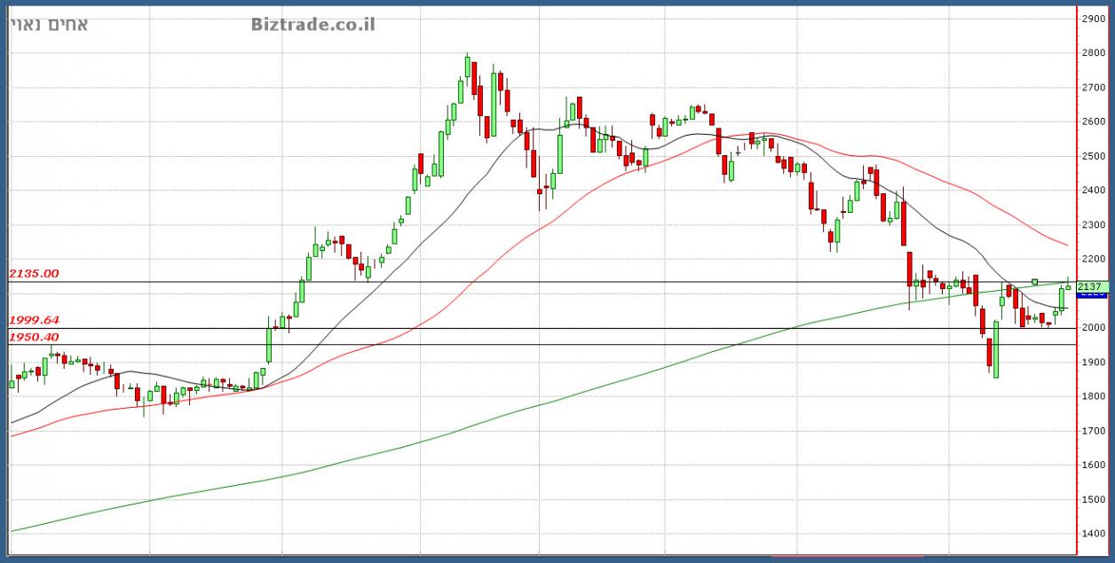 המחיר נסחר מעל ה ממוצע 20 אבל מצא התנגדות בממוצע 200 ביום חמישי האחרון.יחד עם קו אופקי ב 2135 , פריצתם יכולה לשחרר קיטור ולהכניס המון קונים שממתינים, ורק שבירת ה 2000 , יכולה לבטל את המהלך העולה הצפוי.