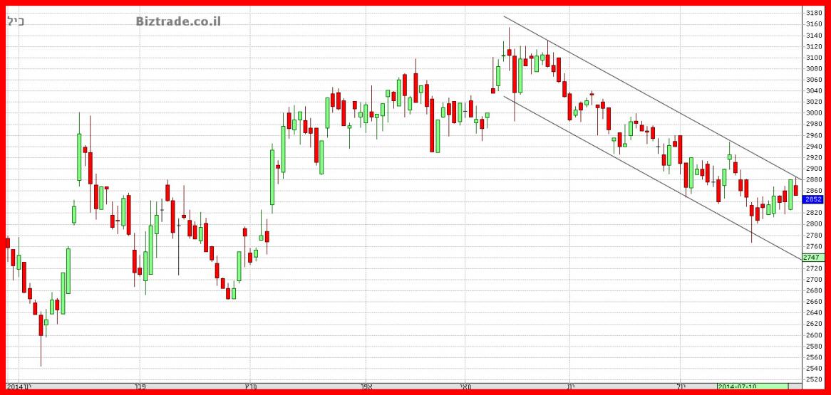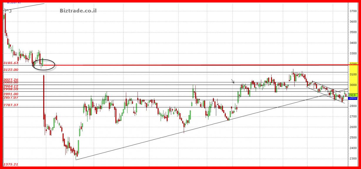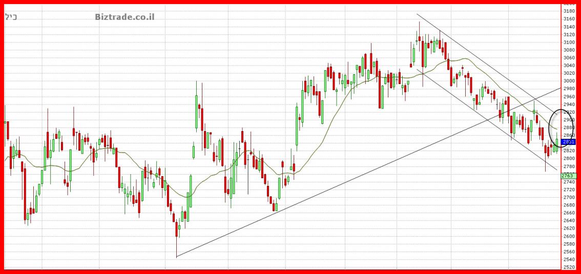 כרגע המחיר עדיין מקובע , ונסחר בתעלה יורדת כאשר משהו טוב יקרה רק בפריצת הקו העליון שנמצא בסביבות ה 2905.