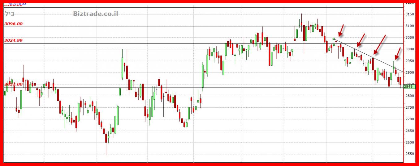 הגרף מציג שפלים יורדם , 4 ברצף המסומנים בחיצים כך שכול עוד המחיר לא פורץ את 2950 לא יקרה כאן משהו חיובי.