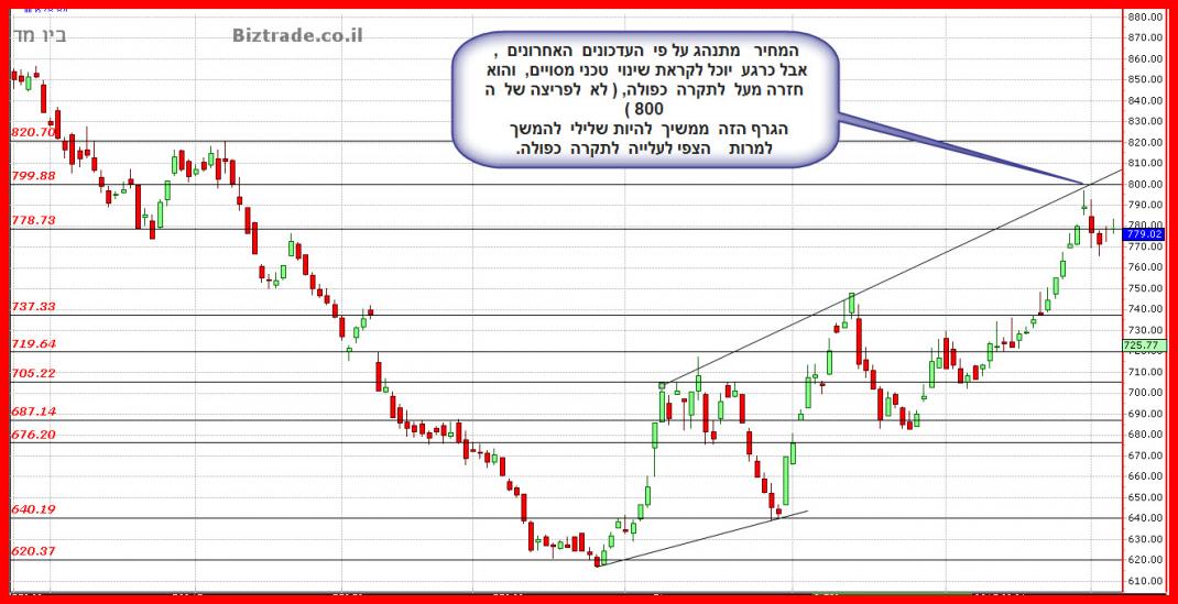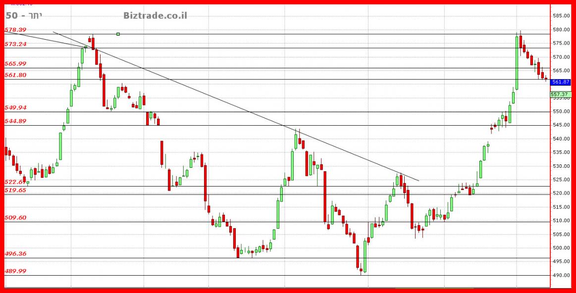 ויצר נר יפני ירוק חריג בגודלו, ומאז בכול 8 ימי המסחר , המחיר שלילי עם נרות אדומים אבל הם עדיין בתוך הטווח של ה נר הירוק ! ירידות קלות אלא מול העלייה החריגה , נותנת לחשוב שהמחיר רוצה לחזור לתקרה כפולה ב 580 לפני שיפתח במהלך יורד כי המהלך היורד קרוב , ואיני רואה כאן אפשרות לפריצה.