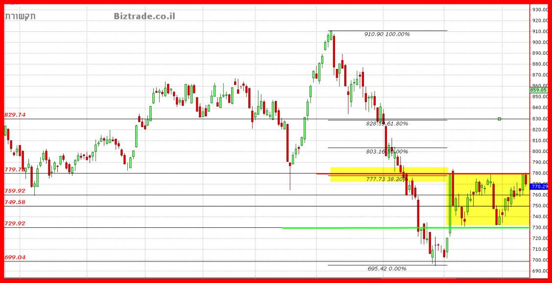המדד נמצא במגמת דשדוש ברורה ומסומנת בגרף כאשר החלק העליון של טווח הדשדוש הוא גם קו ה 38.2% פיבו על כול המהלך היורד שהמחיר לא מצליח לפרוץ אותו. על כן המשכיות המסחר כאן ברור מבחינה טכנית לפחות כאשר תנועה חדשה במחיר יכולה לקראת רק בפריצה או שבירה של הטווח שהוא .... 730 --- 780.