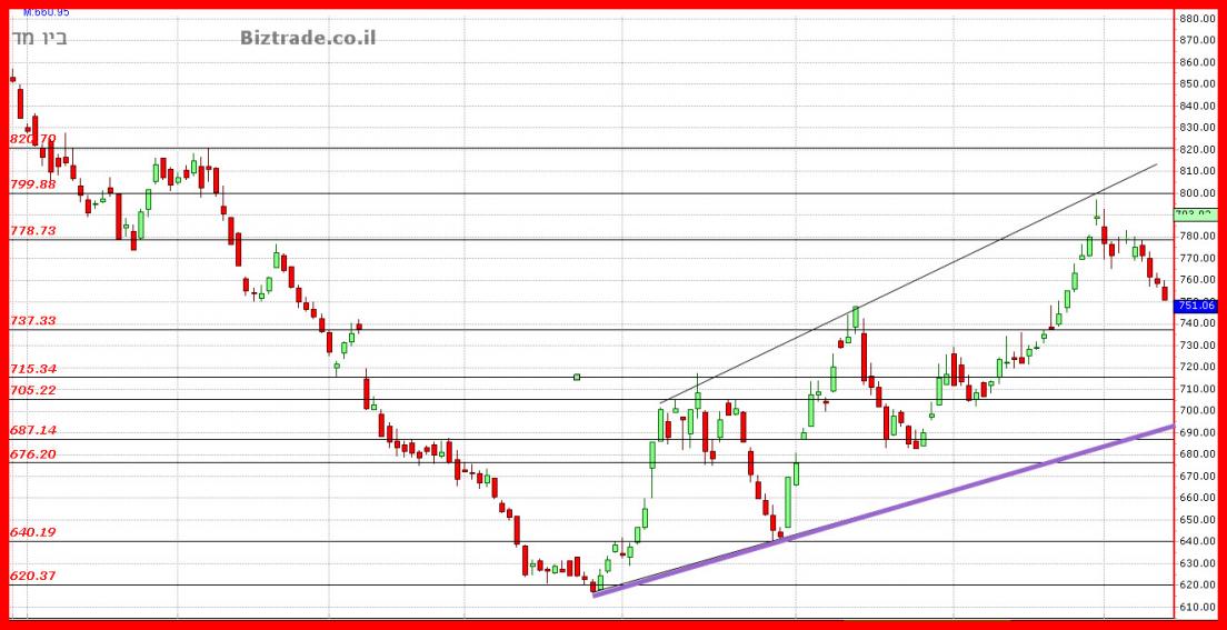 ז"א, המחיר יוכל לנוע לכול מקום שירצה אבל שבירת ה נמוך שהוא ה 715 ידרדר את המחיר עד לקו מגמה עולה אשר נבנה ומסומן במרקר סגול , ובמידה והנמוך ב 715 לא ישבר והמחיר בכלל יעצור ב 737 אזי הסיכוי לחזרה ל 800 גדל.
