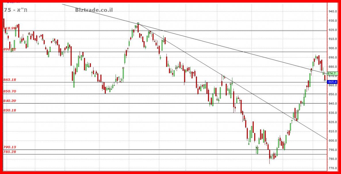 הגרף שמגמת ירידה כפי שהיה , ומתנהג כ כזה , על כן היה כבר צפוי שהמוכרים יחזרו לזירה. עקב כניסתו של הטווח השבועי גם למהלך יורד, הצפי הוא שלילי להמשך כאשר התמיכה הקרובה ב 863 כבר צפוייה להישבר ביומיים הקרובים.
