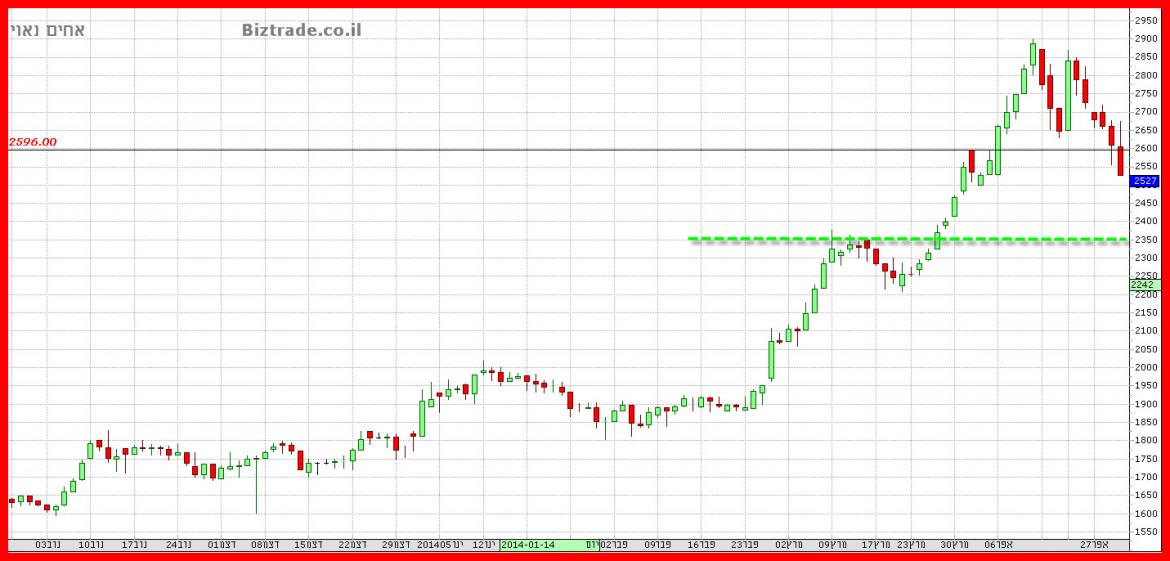 במידה והמחיר לא יחזור מייד היום מעל קו זה ה מחיר צפוי לעשות את דרכו מטה יותר כאשר קו 2350 הוא יעד אפשרי.