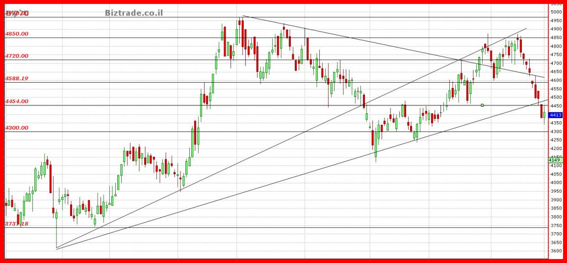 גרף יומי מגיע אתמול לתמיכה ב 4350 , שהיא גם קו אופקי וגם יעד לתבנית M, ושם מתחילים להיכנס קונים בפעם הראשונה ב 10 ימי מסחר האחרונים , וניתן להבים לאורך כול הירידות האחרונות, שהקונים וויתרו והמתינו מטה. על הראש של המחיר נמצאים קווי מגמה שהוא חייב לפרוץ מעלה בכדי להתאושש, אבל למרות שהמתנדים היומיים מוכנים ובשלים , ורוצים מהלך עולה, מהלך זה יהיה מתקן בלבד, כי גרף שבועי רק החל את המהלך היורד שלו , על כן, כול תיקון שלא יגיע כבר ביום המסחר הבא, יוכל לקחת את המחיר לאזורי ה 4600 בשלב זה.