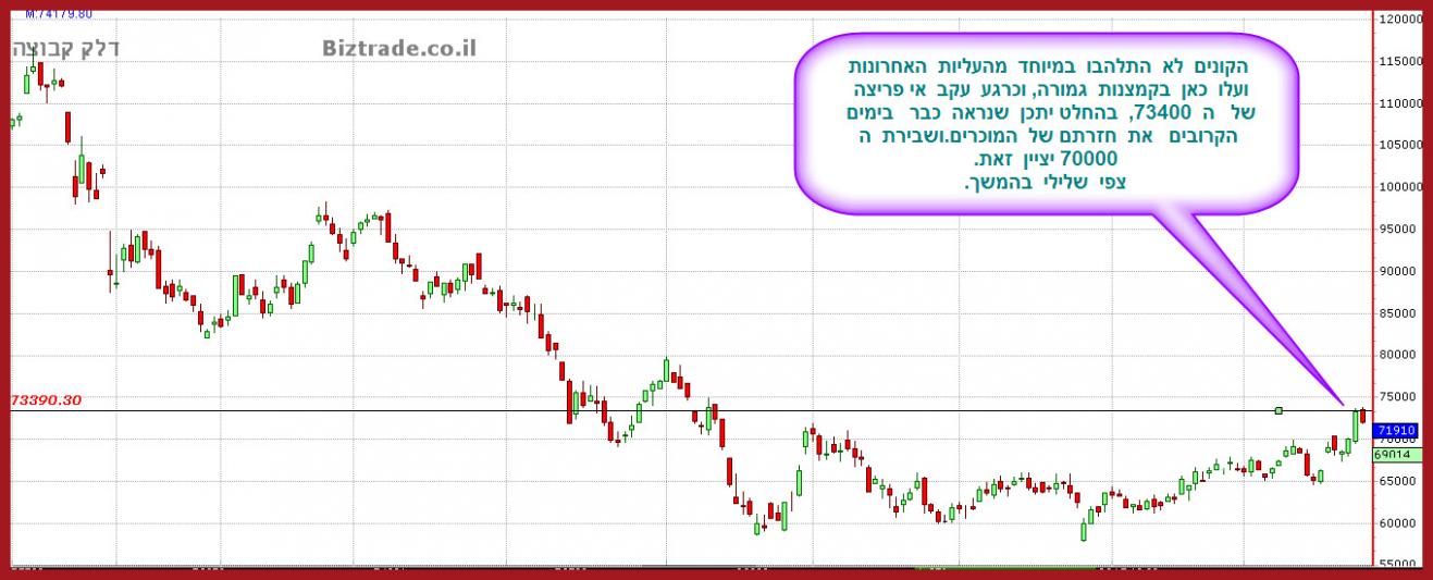 על פי המתנדים הטכניים, אין כרגע אפשרות טכנית לפריצה, אלא באם תופיע הפתעה פונדמנטלית טובה, כי אחרת בכול ערך נתון מהנוכחי ב 233600 עד 237800 , המחיר צפוי לחזור מטה לתמיכות הקרובות.