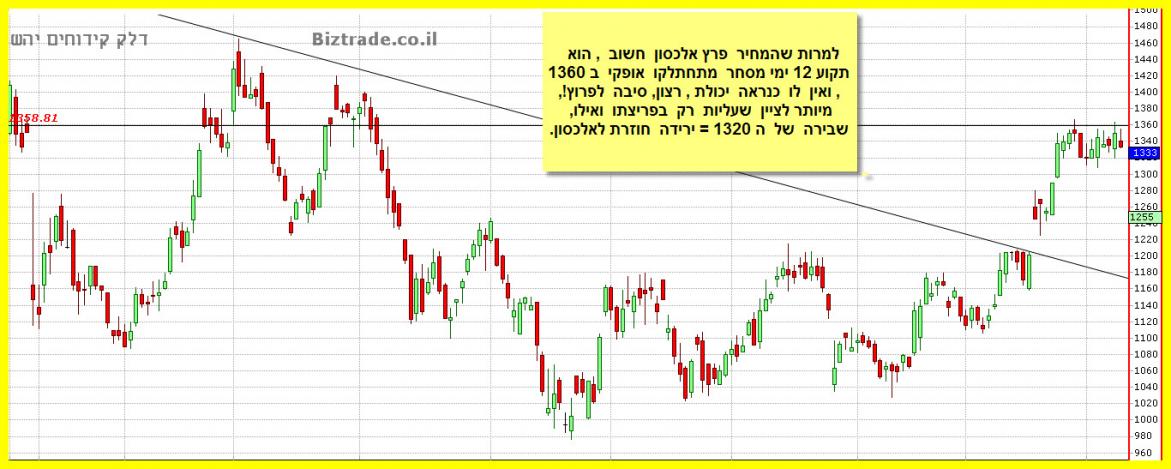 המחיר נמצא כרגע ב 233600 , עם הסגירה ביום ה" אבל !!!! ב 237800 , הוא כבר צפוי לפגוש בעייה טכנית בצורת קו מגמה יורד.