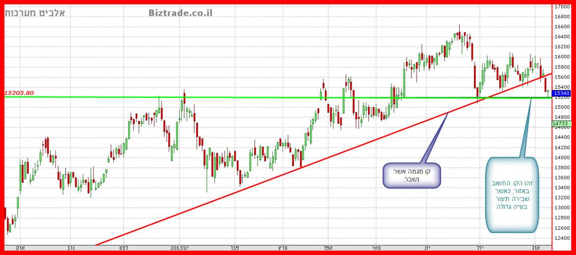 לסיום אומר, ההזהרות לגבי סיכויי הירידות במקום עליות נכתבו בסקירה הראשית המופיע בעמוד 2 בשרשור זה, והם כבר מה 30-06013, בינתיים המחיר ניסה לפרוץ פעמיים את ה 16000, ללא הצלחה. והגרף מגיע מחר למקום עדין מבחינה טכנית אבל גם חשוב, יש לזכור קו מגמה זה תומך במחיר מ ה 25-08-12, כך שבהחלט הוא קו משמעותי, , מצד שני במידה והמחיר לא ישבור את הקו , הוא צפוי לעלות ל 16200, אבל סיכוי זה טכנית הוא קטן מעצם השבירה.