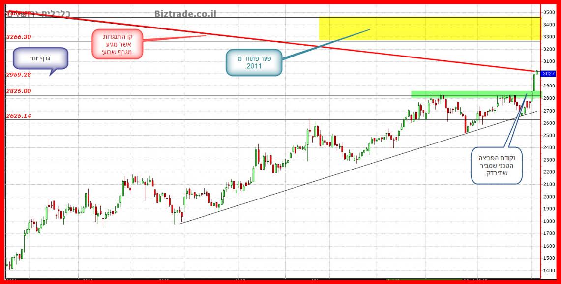 בהחלט יתכן שבטווח הקרוב תתממש כלכלית לצורך בדיקה טכנית של קו הפריצה, שהוא ב 2825 ,על כן כול הישהרות מעל קו זה יצביע בבירור ( לאחר הבדיקה ) שכוונותיה להמשך עליות והגעה לפער הפתוח המסומן בגרף
