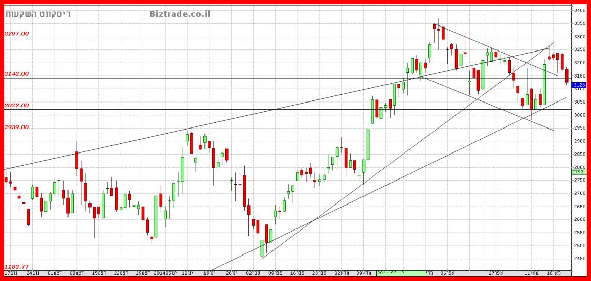 כרגע המחיר נמצא ב 3125, שזה אומר , שבירת קו התמיכה ב 3150 בנוסף לקו מגמה יורד.