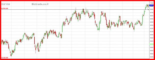 הגרף הגיע ליעד שהוקצב בצפי השבועי, והיא רמת ה 7800 , והנכון יותר הוא גם שבר אותה אתמול ב 2 נקודות.
