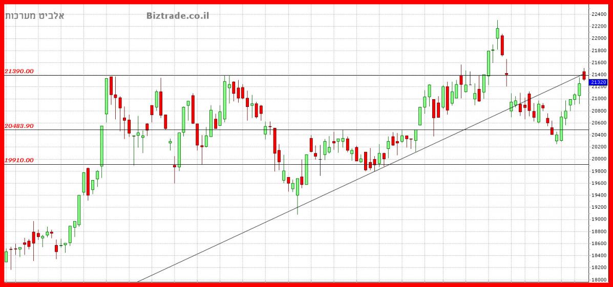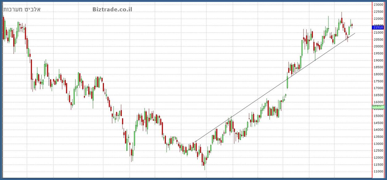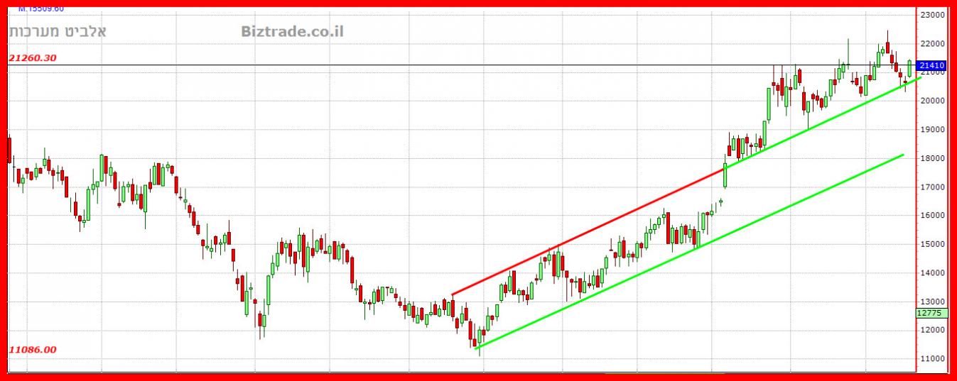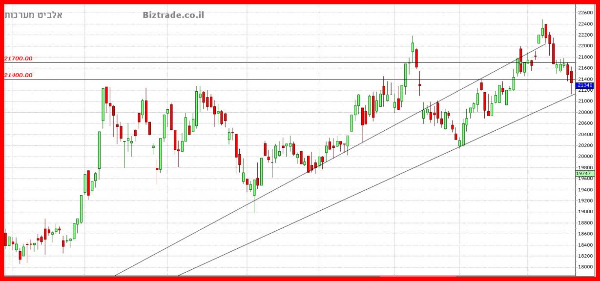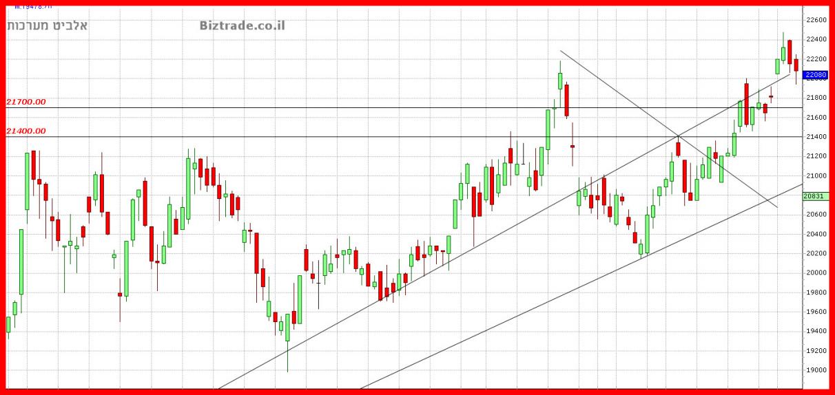 יומיים התנגדות ב קו ה 21400 , כבר הביא היום לניסיון שבירת קו ה 22000 , שהוא השיא הקודם + אחד מקווי מגמה שעולים של הגרף, ( עדיין לא נשברו סופית )