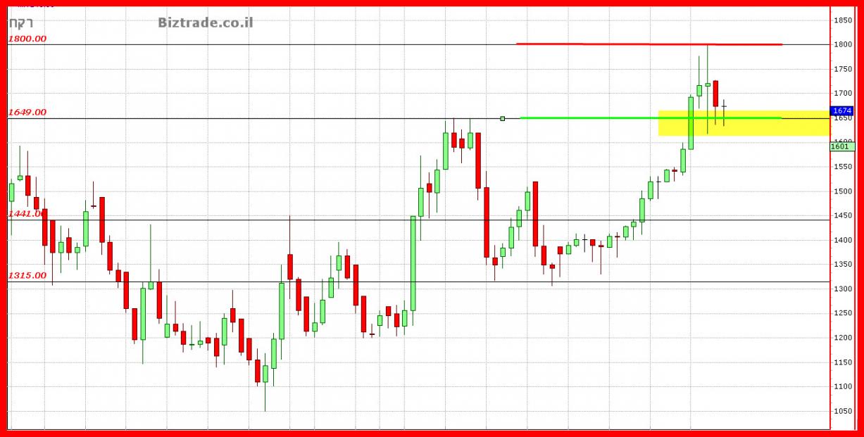 מכייוון שגרף שבועי עדיין חיובי , ניתן לומר לאחר הסגירה של אתמול שהמחיר נתקע בין קו ה 1800 -- 1650, וכול יציאה מהמסגרת של הטווח , ישלח את המחיר ל 150 נק" ומהר.
