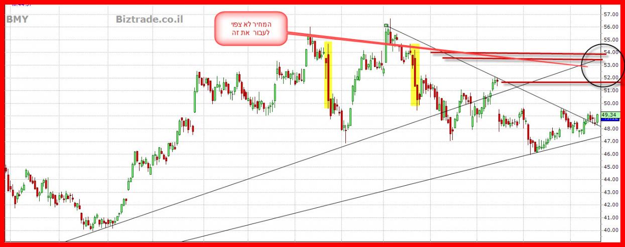 מניית BMY, אני מסתכלת על התנועה מאז ספטמבר הקודם לאחר עליה של כ-40% המניה ביצעה תיקון עד61.8% פיבונאצי, ואז החלה לעלות, לפני כשבוע גם פרצה את הקו מגמה היורד שנוצר מאז חודש מרץ. מאז הגרף מדשדש מעל קו המגמה הזה. מה הצפי שלך להמשך?