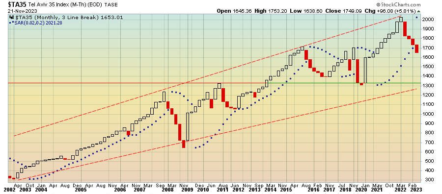 בד"כ אני מנתח לפי עמודות של נרות יפניים המקובלים, אך בחרתי בעמודות "שלושה קווים ועצירה" כדי לבחון את המדד ולפי הבנת הגרף התנועה השורטית בעיצומה ולא נראית העצירה. כדי להביט למרחק העליתי גרף חודשי רב שנתי בו ניתן להבחין בהתנהגות העמודות במרחק השנים והמשברים.
