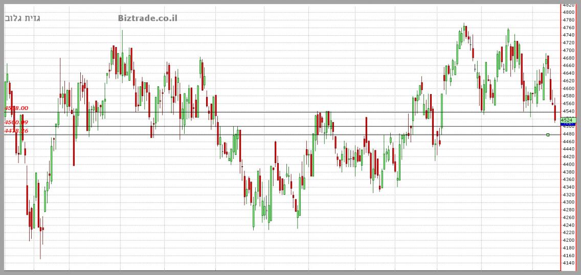 המחיר שובר במשך השבוע את הקו ה 4540 , ויורד עוד כ 100 נק" לקראת ה 4440 , ומגיע לסגירה שבועית ב 4486, עדיין מתחת ל 4500.