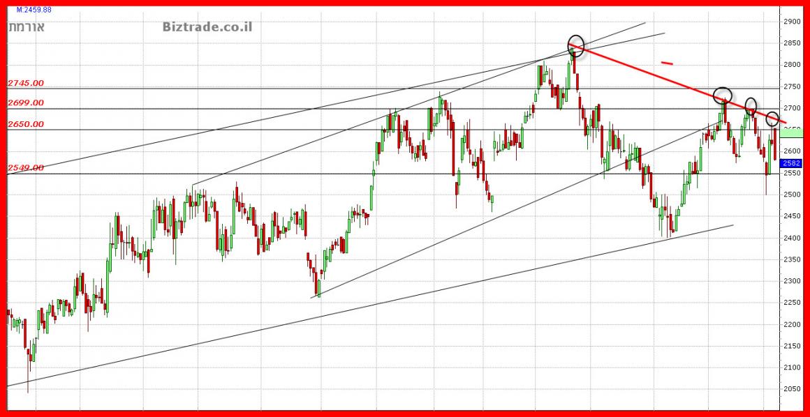 המחיר נתקע בין ה 2550 --- 2650 , שזה בסה"כ 100 נק" אבל דבר טכני עקרוני נוסף קרה לגרף והוא שיא יורד רביעי שנוצר , ומתחבר יפה לקו מגמה יורד.